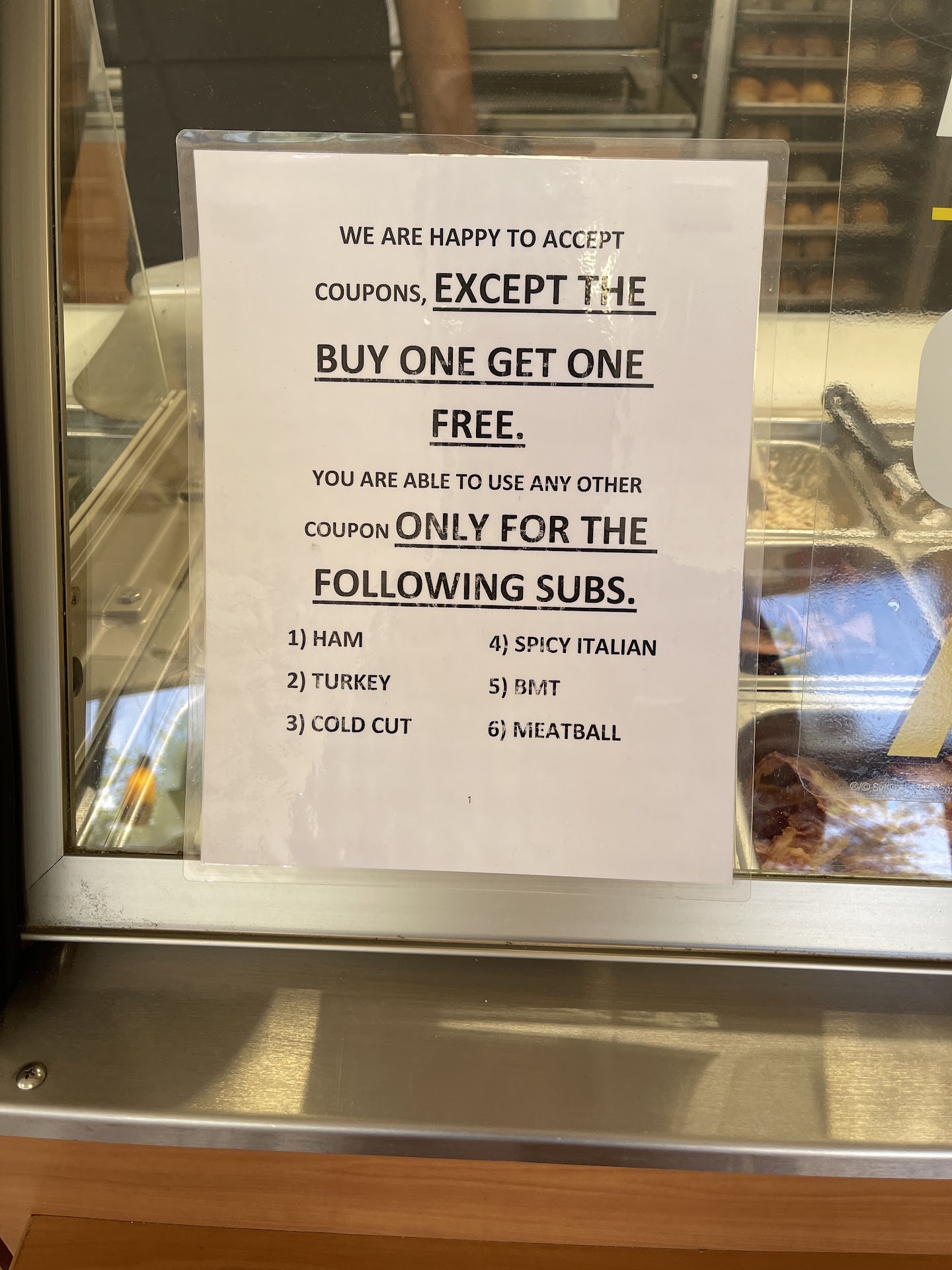 Read moreI was not impressed at all by the service of the staff here. The facilities was not clean. I had received a coupon in the mail two days prior to my visit for buy a foot long get a foot long free they would not honor it because they said people were taking advantage of it. That is false advertisement sending someone mail and it is not going to be honored. I will not be returning to any subway again. It is just not that good. There are so many other places I can get good service and better quality food. I be spreading the word Subway is...