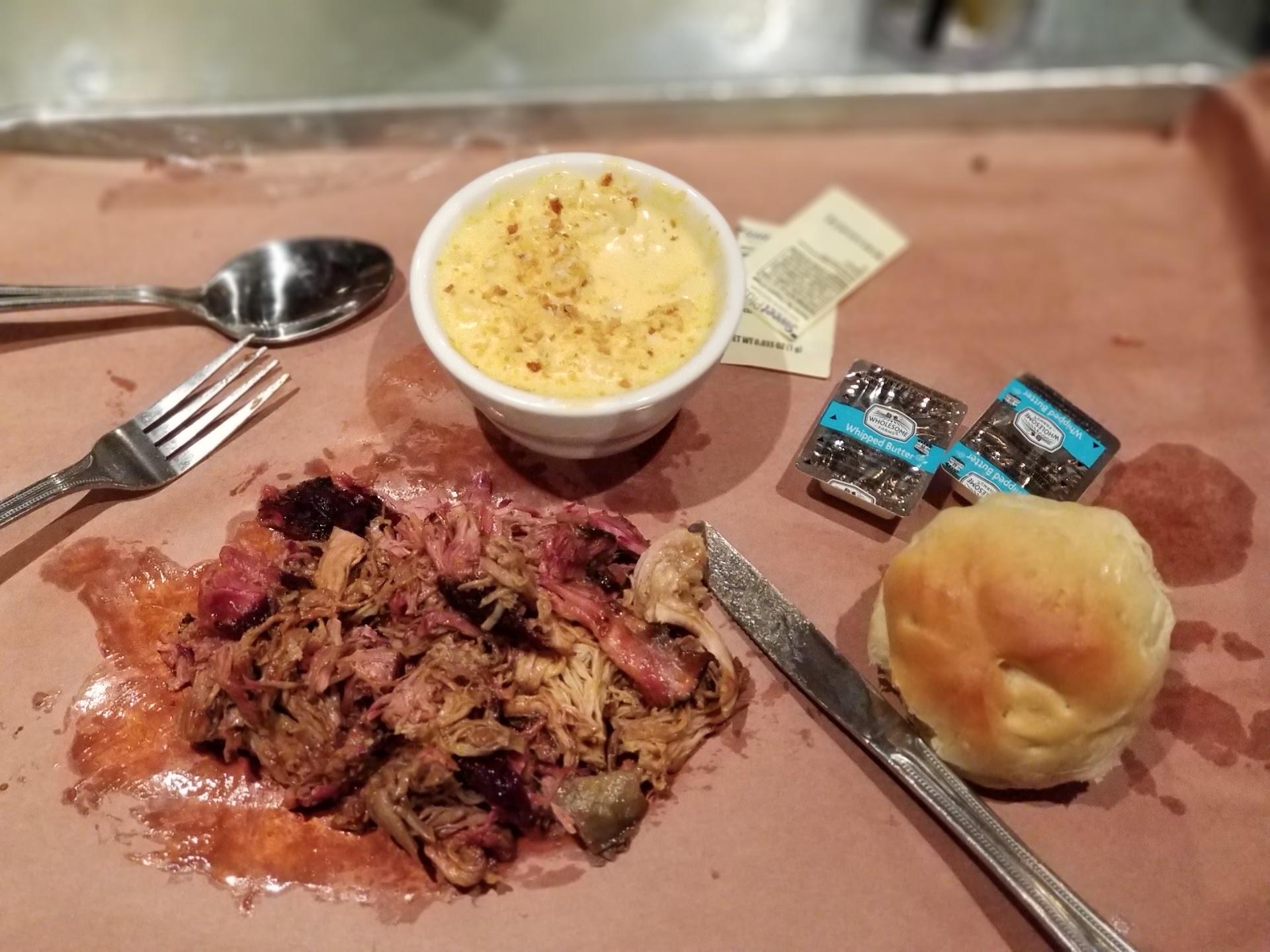 My pulled pork was tender (there were also chunks of crusty meat in there insert drooling here), juicy & oh so flavorful!! That mac & cheese my friends? I dreamt about it last night while I was still digesting everything. It is literally the creamiest, dreamiest mac ever! You will NOT be disappointed! Dinner roll was spot on perfect. Crusty & oh so soft in the center.