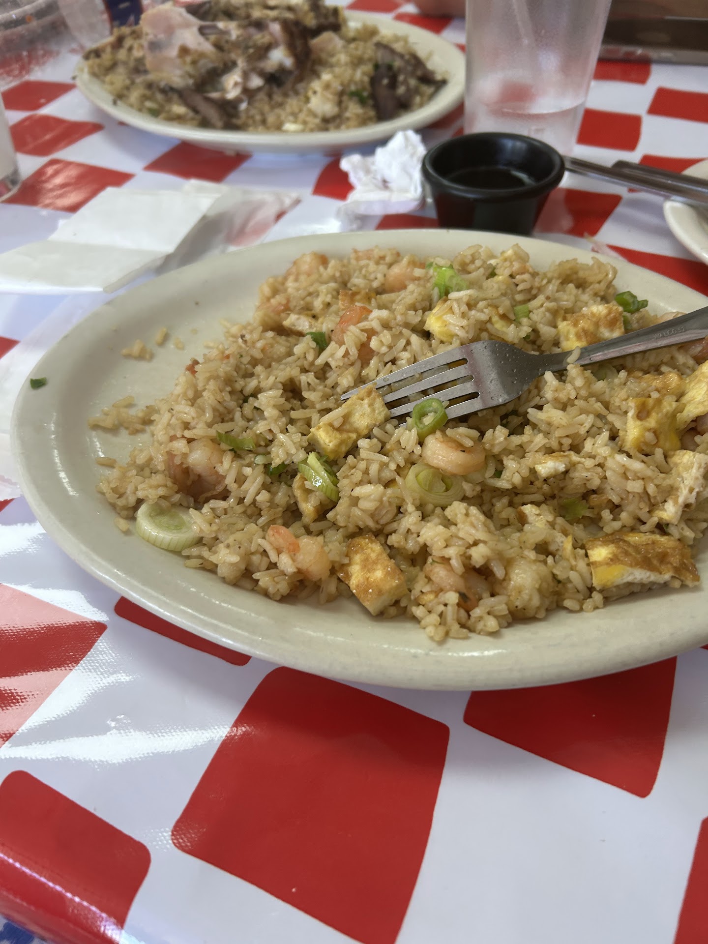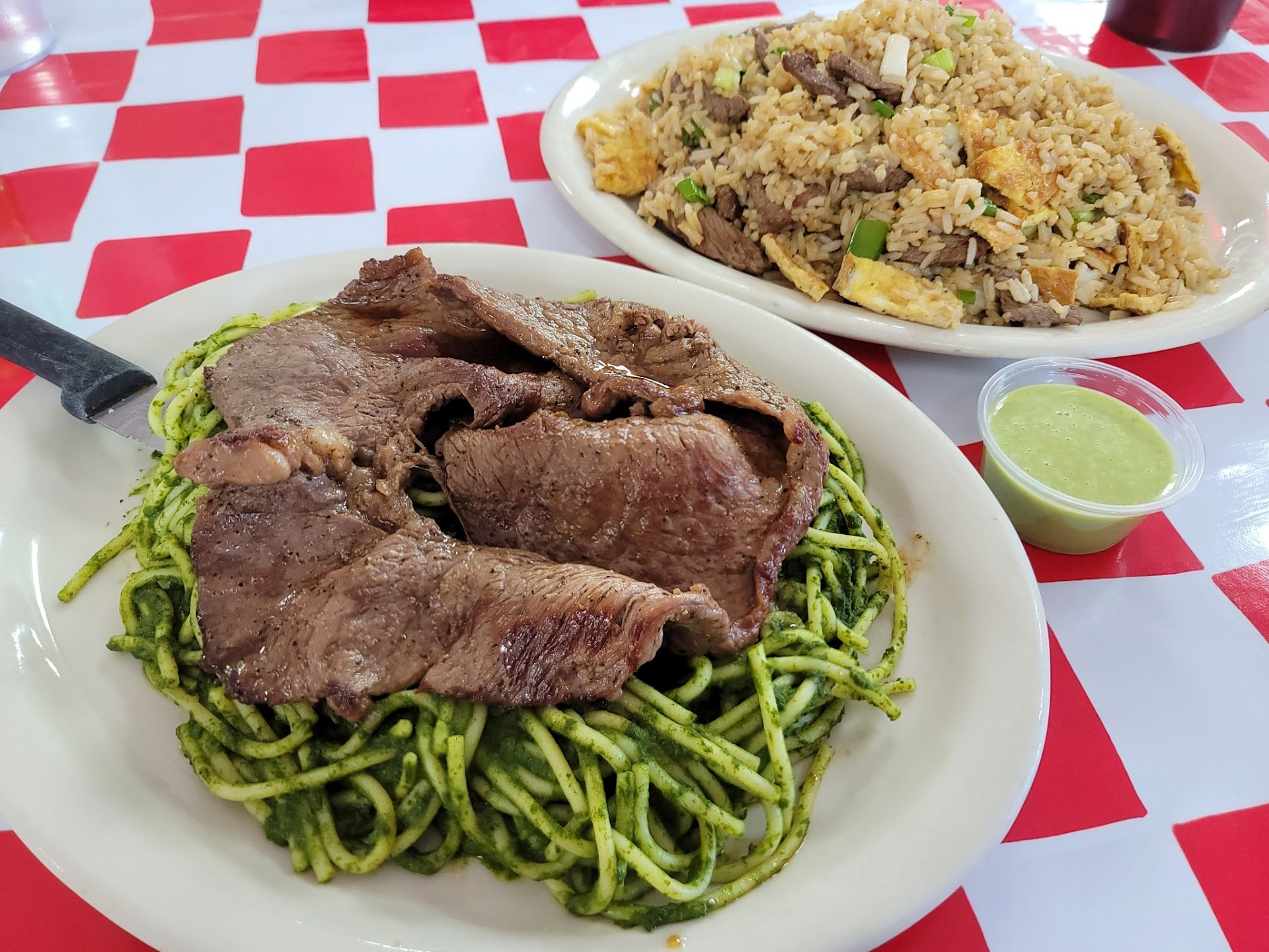 I got the Arroz Chaufa de Carne (beef fried rice) and added some of their amazing green sauce, it was absolute heaven. That may just be the best fried rice I've ever had. My wife got the goat with beans, and was thoroughly impressed, which is saying something as she doesn't care for beans. We got the boy Lomo Saltado and it was savory and delicious. My daughter got Tallarines Verde con Bistec which is a lovely pesto pasta with steak, it's not an Italian pesto, but delicious none the less.