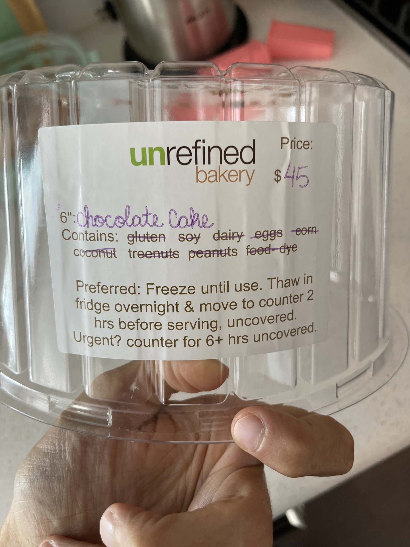 We went to Unrefined Bakery thinking that it was the best place we could buy a quality, clean, refined sugar free, and kinda organic premade cake for our daughter’s 3rd birthday. The cake we chose had a lot of no’s checked (no gluten, no soy, etc…), but not an actual ingredient label. I now recognize our error, but at the time we gave Unrefined Bakery the benefit of the doubt that they were being truthful in their marketing and statements. Upon taking our first bites of the cake everyone in our family felt surprised by the taste. It was too good and familiar to not contain refined sugar. Sure enough, our suspicions were right. It wasn’t until after we had visited a second time for quick dessert, that we had the idea to stop back in for a celebratory treat. This time though, I asked my husband to call ahead and make absolutely sure that they did not use refined sugar, like they said on their social media accounts and on their website.