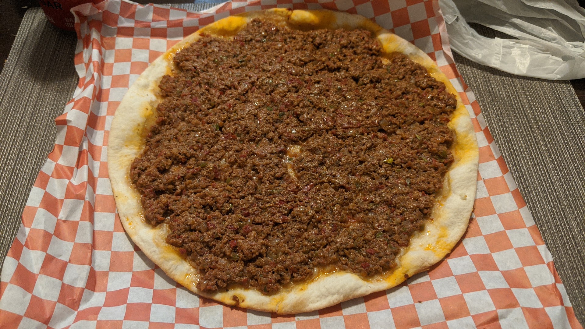 I have yet to try their shawarma sandwiches. Why? They are almost always out in the evening. Their shish-tawwuq plate (chunks of chicken pictured) was pretty good. I highly recommend it. Their lahma bi-ajeen (roughly translated to meat and dough), which is the round 6-in diameter picture below, is pretty light and filling. A household favorite is their Turkish Pizza; which is the long meat and cheese cut up boat in the picture below. And finally, their cheese pies (two small cheese boats in the picture) are pretty good at $1.49 each; and more importantly, rival any akawi pie you can get in the area.