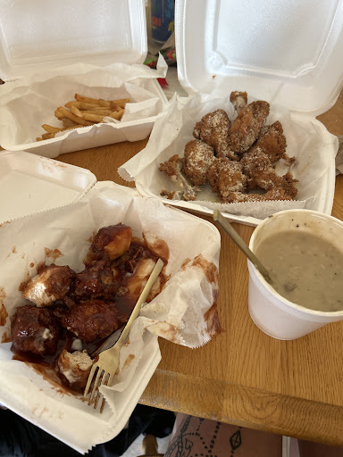 Me and my son ordered boneless bbq wings, bone in garlic parm wings, fries, and the steak and mushroom soup. This was our first time eating here. I ordered take out. Now don’t get me wrong, the environment was cool, appeared to be lots of regulars. I walk in to get our food. To go order was brought to me in a Meijer and dollar general bag. Ok fine whatever, reduce reuse recycle I’m all for that. But we get home open the Meijer bag with the wings in it and bam! Right on top of the container of boneless wings is what appears to be a beard hair or a pubic hair. I cannot make this up. Ok we look past that as well. We try our wings. He got boneless I got bone in. Mine were very good, but they lacked flavor. With garlic parm wings I was expecting a punch of garlic! None at all. I was also expecting them to not be battered. But they were decent. My son’s boneless bbq wings, are literal cut of chunks of chx breast batterer and fried. Which is fine, but the batter is literally falling off all and sooooo soggy. No crunch at all to them. Now onto my soup. I got steak and mushroom soup and it appears to be a can of campbells cream of mushroom soup and NO STEAK! The flavor was ok but I should have added green beans and made a green bean casserole to it real quick because literally a can of cream of mushroom soup. The only things that was amazing, is their ranch....