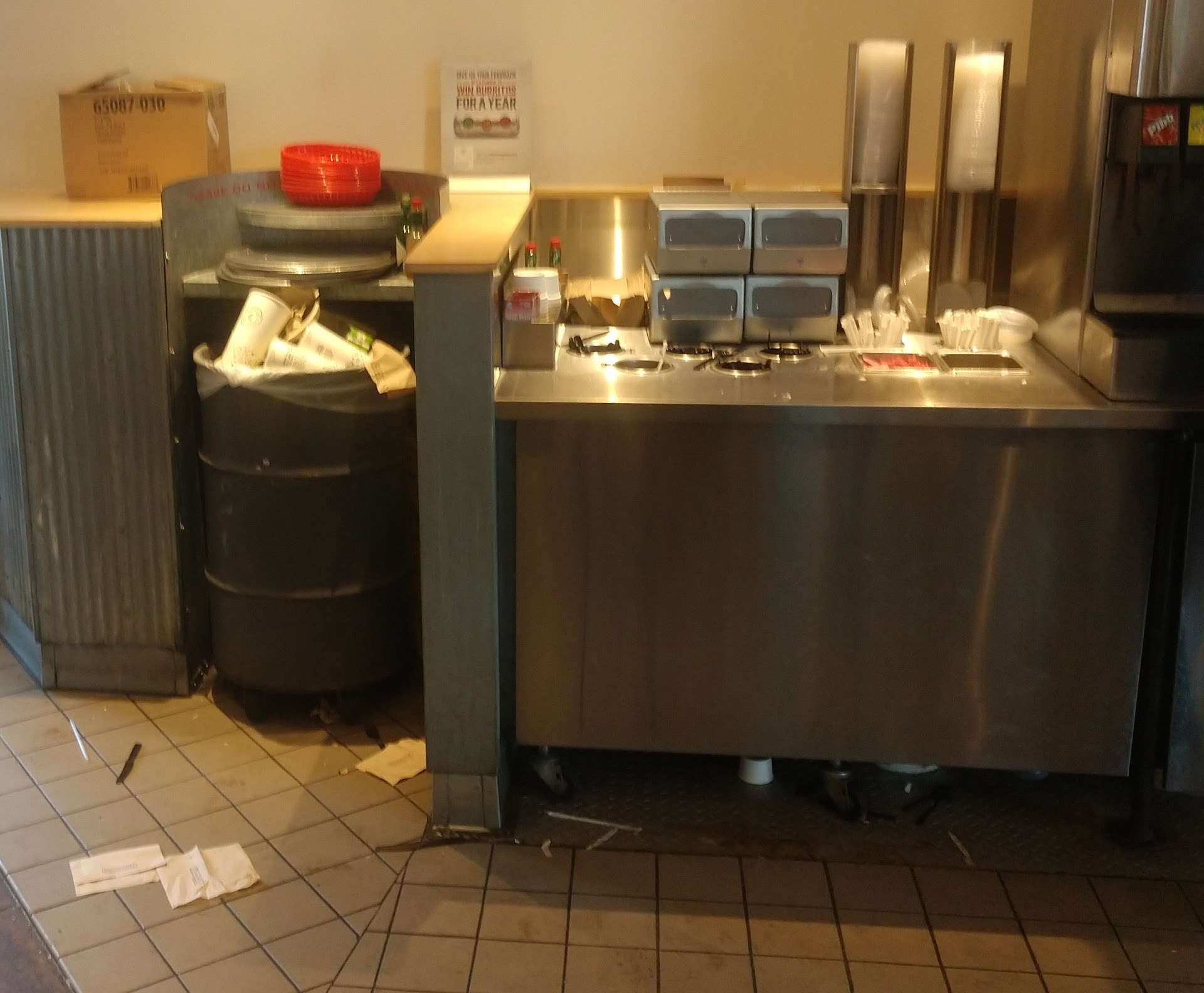 Read moreSaturday June 1rst around noon. Hungry and looking forward to having a yummy lunch. There weren't many customers eating inside, and there wasn't a line to order. No line at lunch time for Chipotle in the twin cities metro is rare. The young woman behind the counter greeted us with a look that should have made us turn around and walk away. The rest of the employees seemed to be in a back corner arguing about who's job it was to be working at their job. We did get a few employees who peeked around the corner, looked us in the eye and proceeded to ignore our willingness to make their paychecks possible. As we had our orders filled, a line started behind us. The young woman who was fixing our orders started to make the other orders from the line of customers behind us. While waiting to pay and enjoy our food another employee came from the back and instead of ringing our orders she asked the woman who was trying to help everyone a question about an order. And after 10 minutes we finally were able to pay. And once we had our food and went to get napkins the full extent of the management training style came into view. In this photo you can clearly see that the napkins are empty, trash over flowing, unswept walking paths, piles of dirty dishes, and bits of food in the plastic utensils bin. I was needing to use the restroom, but I had a paranoid feeling that there wouldn't be enough antibiotics to help with whatever I would catch from touching the door. I wonder just how bad the management is here. I've never seen a Chipotle in such a disgusting state of embarrassment. To the young kids working there, get out now! The management team is setting you up...