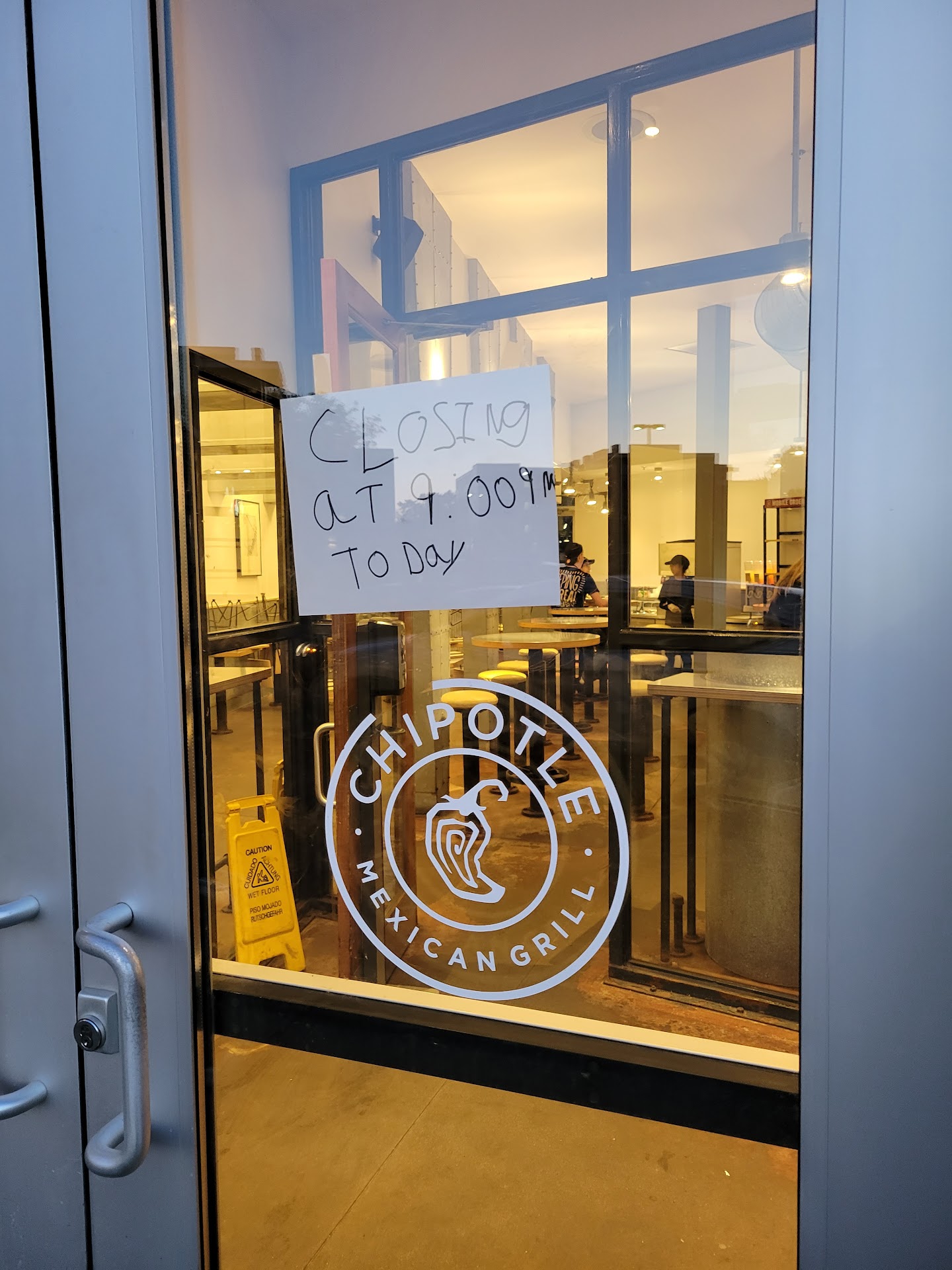 I was told my order would be right out which translated into 20 more minutes. In total, I must have waited in the dining area for 45 minutes. On a positive note, I did manage to experiment with some theoretical physics equations on a few napkins to keep myself distracted from the worst possible experience I have ever had at Chipotle.