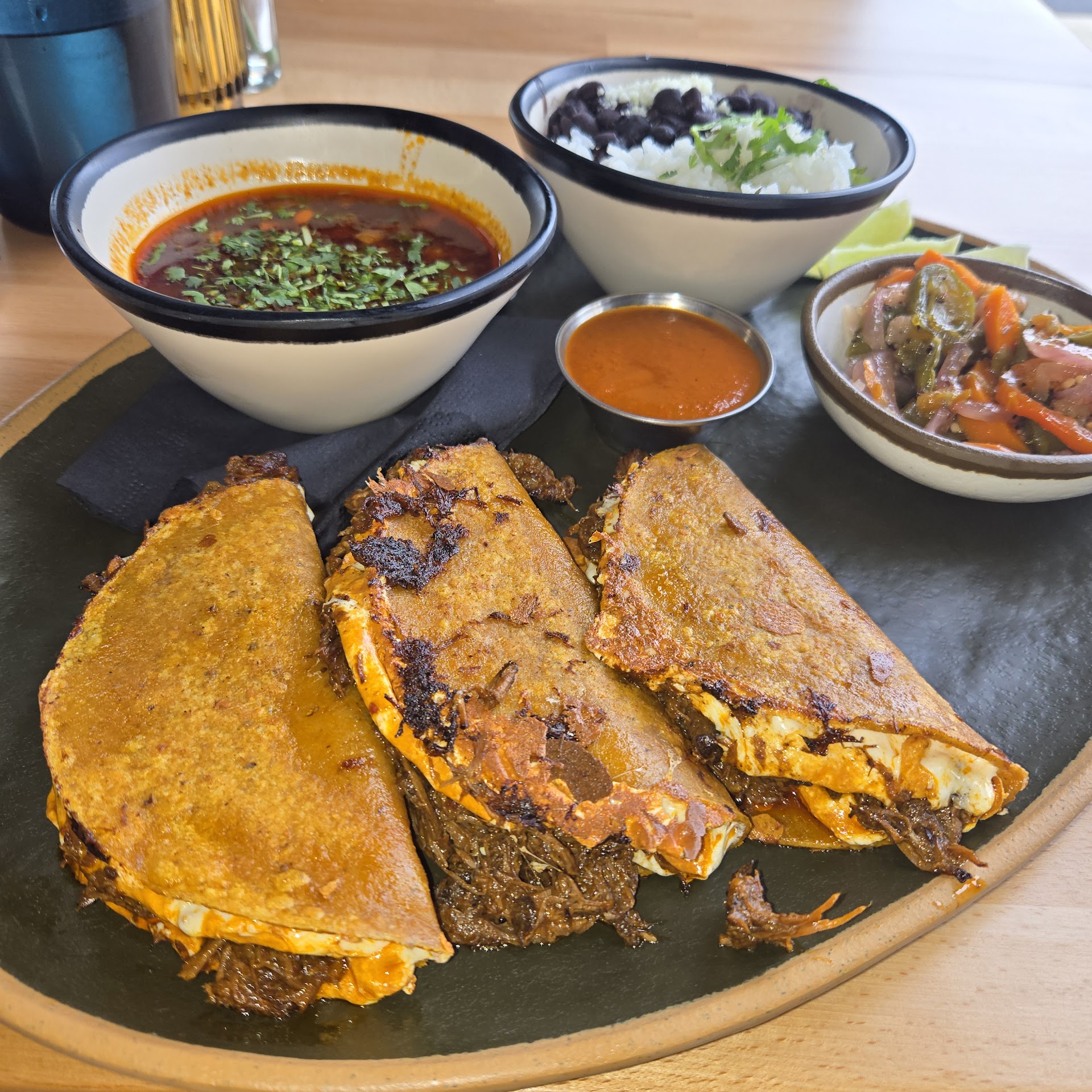 Ā Ā Ā Read moreStopped in to try out this new restaurant, have been watching it get set up for a few months, and saw how busy it was. Ordered the Beef Birria and Chicken Asado tacos, and a Horchata. Horchata came in a glass that felt like a child size cup, half full of ice to start. Tasted great, but it needs to be in something larger than a sippy cup for $5. Was in a party of two, the four tacos we ordered (2 each separately) came out on one plateā¦.and I couldnāt tell what was pork and what was chicken. All were lukewarm, and two were not done to my partnersā request of āno onions, salsa on the sideā. I easily finished my horchata due to the spice of the beef tacoā¦.it was actually too spicy and the meat near cold. Went back up and ordered a bottle of Jarritos to have something more to drink, and decided to split a dessert to not completely strike out on my first visit. The Tres Leches Cake was a winner! The place is new and sure to have hiccups, so willing to try it again after things settle downā¦.maybe. Theyāre dine in only right now, no take outā¦that is coming soon. I hope they work things out, as there are at least three other great taco options in Richfield and Bloomington within a quick drive. Ending with a positive, whoever decorated and built out the inside and outside did a great job, it looks fresh and updated insideā¦.and the open bay windows to see the back by the grill is a nice touch, looks like a family run restaurant and I hope they last a long time...