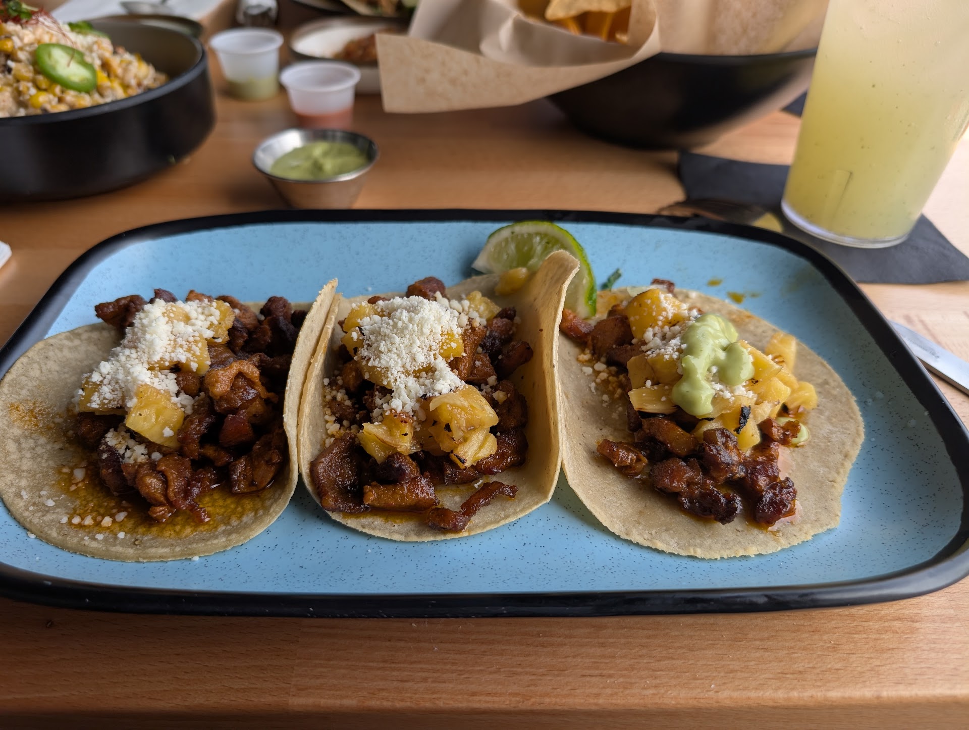The Good: The el pastor tacos were on point, as was the street corn. Both came with a ton of flavor and (contrary to other reviews) ample toppings. I will be back for the el pastor alone. I also really enjoyed their chicken tacos, which were uniquely smokey (and we were told were local to Cancun). The salsas were also well done and had both heat and taste. The agua frescas curiously stole the show. Both the Jamaica and the Cucumber were absolutely top-notch.
