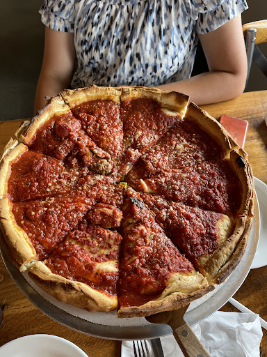 If you like deep dish pizza, GO HERE! Amazing amount of cheese and plenty of toppings make their pizzas one of a kind. People literally drive from hours away to get this pizza. The reason for the 4 stars was due to #1. Our server had more of a "curt, I'm having a bad/pissy day" attitude than we'd experienced here before. Not very warm or welcoming, which was surprising as we were 1 of only 4 or 5 tables that were occupied at the time. We were hoping for a bit more on the service side, as we had people with, eating there for their 1st time. We still tipped very well, as everyone has bad days and we're hoping that's all it was and not a new care free,drop in customer service type attitude. #2. Their tables are very glossy, and apparently curve towards the floor right at the end of the table. This was discovered by witnessing my tall beer, which was 2/3 full, sliding, ON IT'S OWN, almost an entire foot before falling off the table due to "condensation between the glass and the table top" we were told. FORTUNATELY, my peripheral vision saw something moving and I was able to catch the glass in mid fall. UNFORTUNATELY, our friends daughter experienced her 1st beer bath as the beer flew out of the glass and all over her and the booth, and her food. 🤦 Definitely need to do something about the edge of the tables to help make them not so slippery by the edges. Or at least inform the customers to be cautious of items sliding around on their own. The issue we had with this incident WASN'T that it happened, but rather the waitress, as she walked by, nonchalantly saying, " oh, the moisture makes the table slippery at times" , confirming what I thought, which was that this type of thing must've happened before! I cleaned it all mostly up myself B4 she came back with a small towel. She didn't offer to replace the beer, or the root beer their daughter was drinking, or her spaghetti, all of which had been bathed in beer, or extra napkins, nothing. ESPECIALLY when she knew it was none of our fault. We definitely weren't there looking for a handout, but at least to offer any of that would've been at least courteous and appreciated. When you spend almost $250 on a meal, you kind of expect a little better service you know? Now, that said, the meal itself was great, like usual and everyone had a very nice time. Well, except for the beer bath recipient. But she was in a better mood when she got to change Into the Clothes we stopped and purchased for her. All in all I recommend you try their DEEP DISH PIZZA if you like cheese and want to enjoy a great eating experience. Just keep your drinks in the middle of the table or bring a little bumper to prevent sliding...