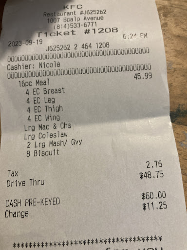 Read moreI wanted to place an order of 14pcs at 8:30pm. I was told they were OUT OF CHICKEN!!! I ask how and was given a bunch of excuses: from Door Dash to a Game! I asked would I be compensated for the inconvenience ( some restaurants do if they cause a customer to be inconvenienced), of course I was given the we don’t/ can’t do that! I asked how long it would it take and was told about ten minutes “maybe”. Well, I was willing to do that. I drove up to the window and told the clerk I would park and wait. Well of course I was told I had to pay first! You know what I did?!? DROVE OFF! How the heck does a chicken place run out of chicken 2 hours before they close? Either management is not properly managing or they just don’t care if...