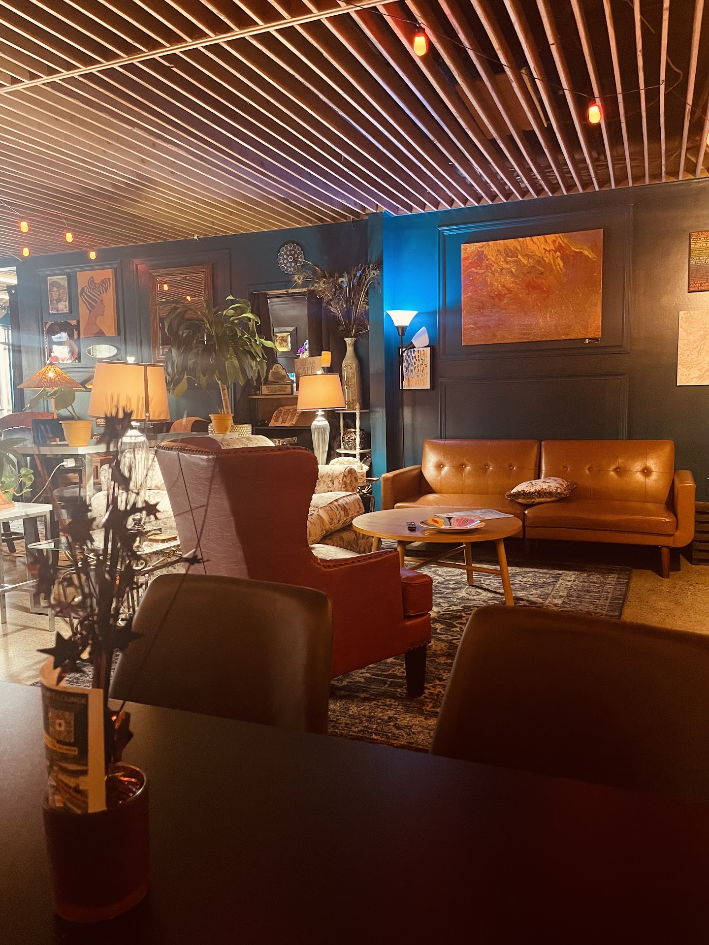 I love how the entire inside is decorated-moody, dark-colored walls, warm Edison lightbulb string lights, & gorgeous art on the walls. I took a photo for reference. Super cozy. 🤍