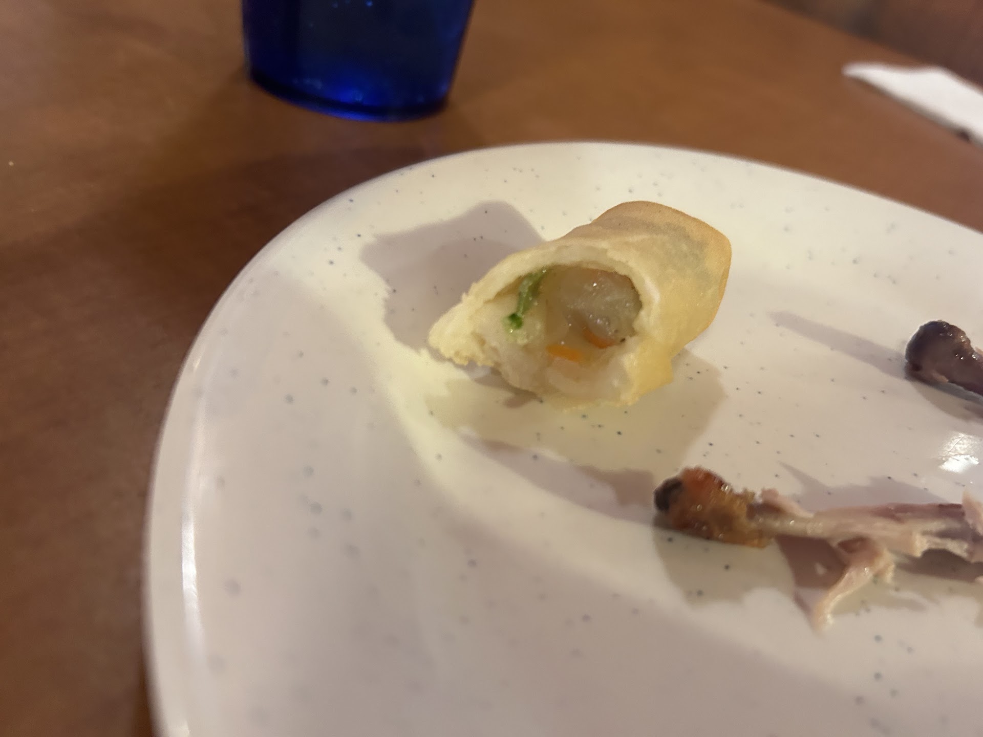 Not a good beginning: The food I put on my plate from the first buffet island, when we arrived, was cold. I was disappointed that the rice wasn't very good as you would expect from an Asian restaurant. I also picked up a small skewer of bright red meat, which I think was pork. One piece had gristle on it and the others were dry and very overcooked. The deep-fried squid looked like onion rings and it was ok.