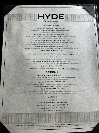 Unfortunately my meal didnât turn out as well as expected but Austin apologized and offered me several options. I was very appreciative and understand sometimes things happen but I loved the fact that the restaurant wanted to make sure I enjoyed my experience and we did. I would recommend Hyde and will return thanks to the excellent customer service I experienced and look forward to giving some other dishes a try. The only thing Iâd like to see Hyde have is a dessert menu. Other than that, the place is great and itâs...