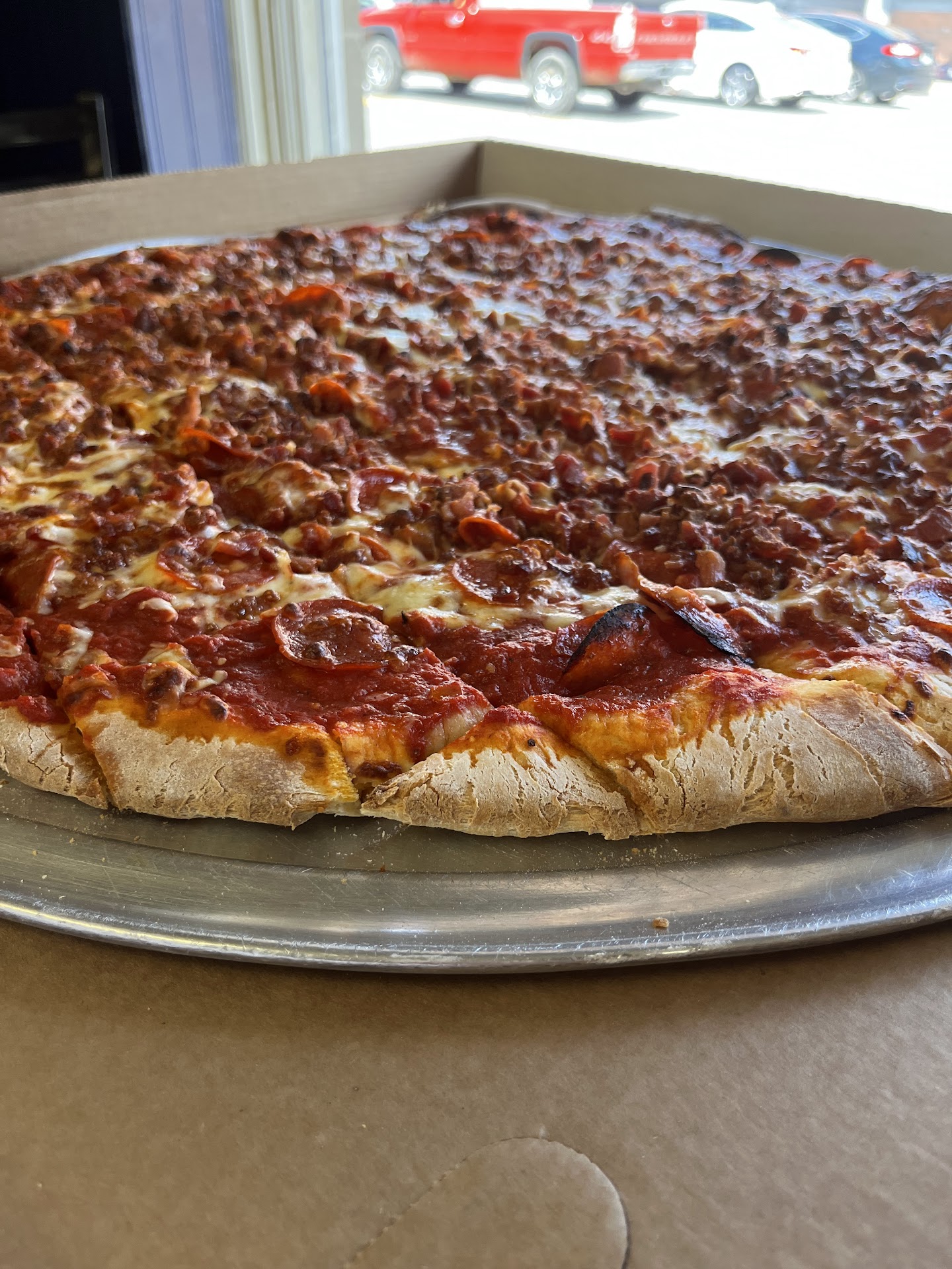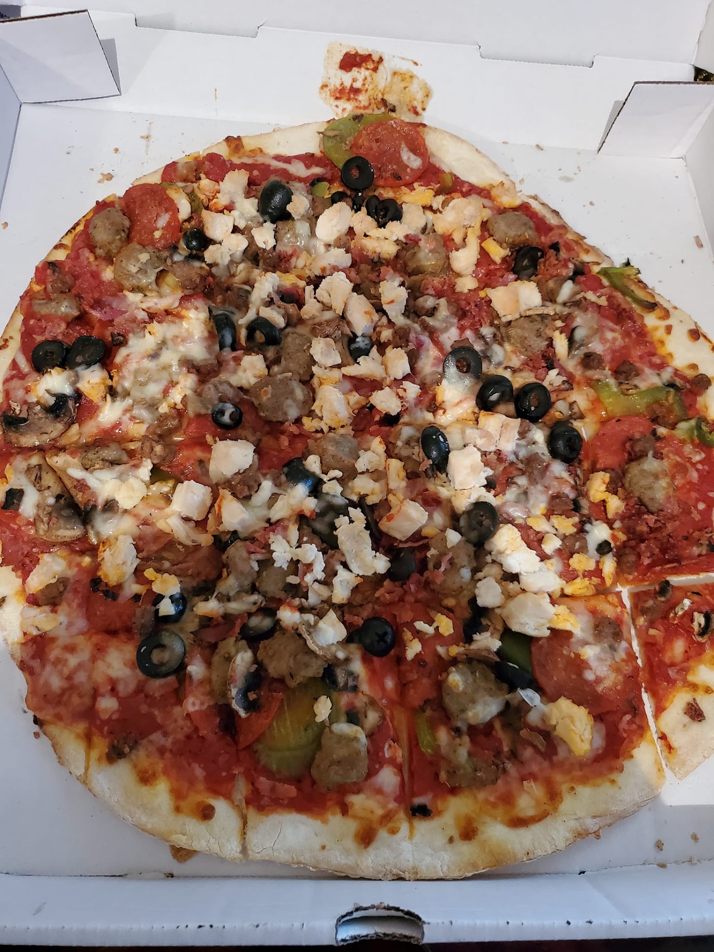 Read moreWe ordered a 14" Mastodon, which according to their website has: Sausage, ham, bacon, pepperoni, beef, onions, mushrooms, green peppers, black olives and extra cheese. We ordered it without the ham and added chicken. When we received it, it appeared to have no cheese. I called the restaurant, and spoke to someone who identified themselves as the "owner". I explained that our pizza didn't have cheese on it (let alone extra cheese).