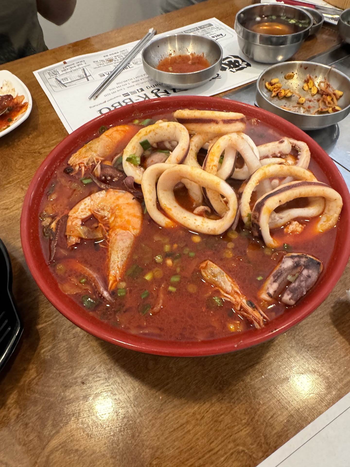 I want to start by saying the setup of this restaurant is really cool. You basically have your own room which is very nice. Especially if you have young children like I do. In the room they also have a doorbell if you need service to call for. The service was so great we really didn’t even need it. They have pictures with almost all of their food, if you’re not familiar with Korean food. We started with the kimchi pancake. It was hands down the best kimchi pancake I have ever had. We ordered the spicy seafood soup and shared it between three of us. We added on undo noodles and that went perfect with it. I was pleasantly surprised by how much seafood was in the soup and the broth was out standing. We also had spicy bulgogi and regular bulgogi and both were delicious. Thank you so much! Can’t wait for...