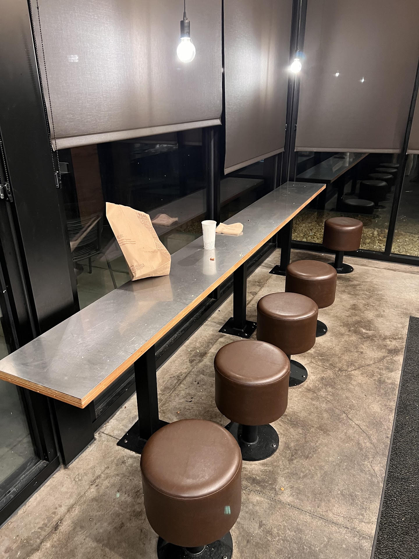 Read moreI agree, tables not wiped off, out of soap in the bathroom, and just in general I assume this is how the whole franchise operates.... Bottles of tobasco for hot sauce, i like tobasco but would have thought there would be fresh salsa like Surcheros, or Tijuana Flats or Juan's.... Nope, just tobasco, 3 flavors and most of the bottles were empty or near it. Surcheros puts their burritos in a press and crusts the outside, gives it this nice flavor, char, really nice. Here, you get what you get, a mildly, barely luke warm burrito. Chips are extra. Really? Surcheros you just get chips with your meal. And i assume theres no "meal combo" option where you can get a main entree with chips n a drink. One girl was great and on it behind the bar. The others were there and doing their due diligence. So really nothing aginst the staff. Iguess they could have taken a moment out of joking around to fill the soap or clean the tables or sweep or mop... I dunno maybe thats just me. Staff seemed nice enough though. So ya, not coming back for what i paid for what i got. Nope nope nope nope..... Trash cans overflowing?! Wheres the freekin manager to tell these children what to do? They're not going to do jack if you dont tell them to do it!! Out side trash? Beer bottles? Seriously?!! The freekin concrete floor didnt look new, it looked like it was borrowed from a 100 year old school that used to be there. Wow!!!...