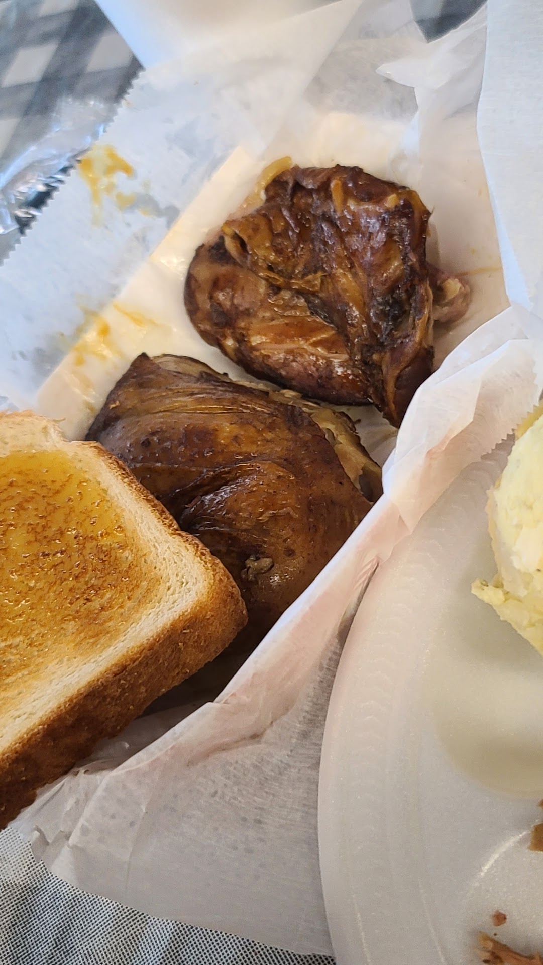 Read more2nd time and it's all a big regret. The 1st time was not great, but this was awful! For a holiday weekend Friday, you'd expect fresh food. But no! Dried up old pork, chicken was the same and no seasoning, very old macaroni, and the greens were burnt! It tasted like they try to reheat the greens and burn the bottom of the pot. I would review the Brunswick stew but we ordered it and never received it. The potato salad clearly came out of these very large plastic containers that were in the drink refrigerator in the dining area. No homemade items here. It's a shame that this is representing barbecue in our area. Some oversight and management is needed. The dining area is dated. Simple things that has an easy fix was overlooked such as the vinyl tablecloths that are many many moons passed their prime. The customer service was good, except the...