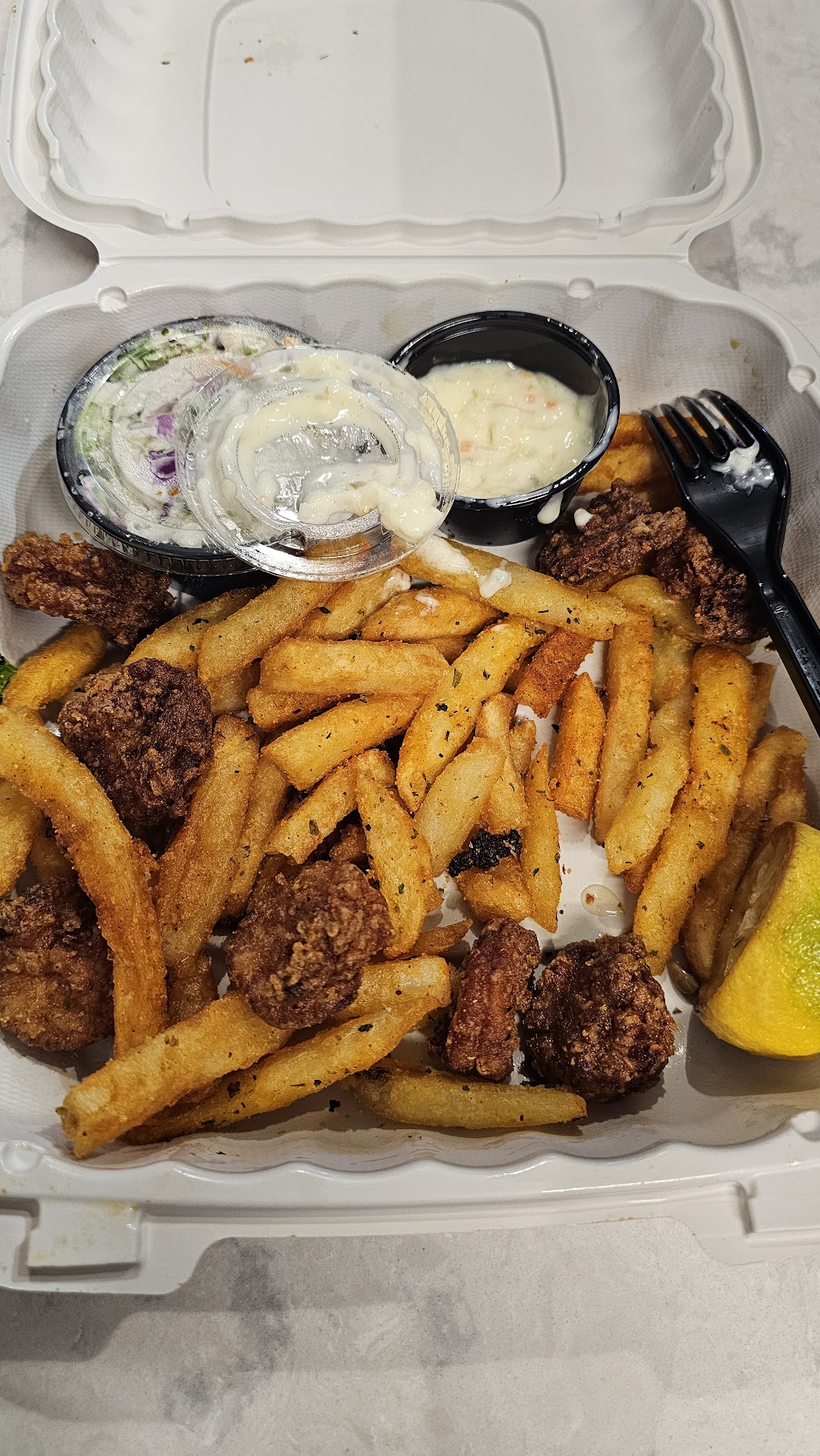 My colleagues and I immediately opened the food and were so disappointed to find that our food was very cold. Stale, cold, dried out fries all around. One colleague's cheesesteak was so cold that the cheese had solidified and wouldn't release the sandwich from its to-go container, and the roll was soggy. My other colleague's po'boy looked sad, with five pathetically small, cold, not-crunchy, overcooked shrimp on a roll with wilted lettuce and mealy tomato slices drowned in remoulade. My meal of the shrimp platter was no better- eight tiny, stale, cold, greasy, overcooked shrimp, that had no crunch and tasted like old fryer oil (you can tell by how dark they are in the picture), some room temperature tartar sauce, and room temperature, bland slaw, and the same sad, cold fries as my co-workers. Incredibly disappointed in the food. In my pictures you can see how overcooked the tiny shrimp are by how aggressively curled they were.