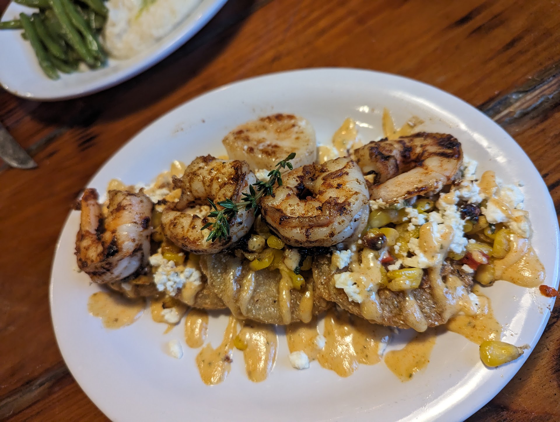 Read moreStopped in Richmond Hill for the night on a road trip. All of the produce stands we'd stopped at since leaving Tampa had me craving fried green tomatoes and my travel companion was in the mood for a steak. Found this place with a quick Google search and, with so many great reviews, it having what we were looking for, and it being practically next door to our hotel, we decided on The Local on 17. I was all smiles when we walked in the busy restaurant. No wait, pleasant hostesses, lovely ambiance, and a talented pianist greeted us! Our server, Forrest was great. It seemed we were one of many tables he was tending to but he was perfectly attentive, without being overbearing. He was helpful in accommodating a special request, making excellent suggestions, and even telling us a bit about Richmond Hill and things we may enjoy seeing while in town. A+ FOR SERVICE! THANK YOU, FORREST! Now the food. I'm a professional chef and a huge foodie. My fellow foodie friend ordered the petit filet mignon with two sides. This is one of the best steaks I've ever had in a restaurant and it wasn't even priced very high. Perfect med rare, perfect seasoning, melted in the mouth, literally reminding us of a5 Wagyu. Obviously it wasn't, but that insanely rich, melty mouthfeel was incredible. The whipped potatoes were smooth and perfectly seasoned. The green beans were just a tad soft for my taste but still good. Now, to the fried green tomatoes. I've made/ordered/eaten more than the average person, I'd assume. I don't know that I've ever had any that I don't like BUT I think these may have been the best I've ever had. Perfectly paired with the aioli, corn salsa, and feta. With every bite, I had something to say about them. I opted to add the blackened shrimp which were, not to be redundant , perfectly cooked and seasoned and Forrest hooked me up with a big ol' scallop, which was not offered a la carte. We opted out of desserts Forrest offered because we were more than satisfied with the plates that we devoured. Both of us fed and sated for $55! ( Before tip) What a deal for a steakhouse that we will be talking about for forever. This will be a definite stop every time we make this trip. So pleasant surprised. Thanks y'all. From...