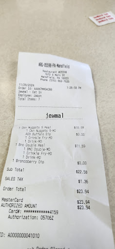 Last four times ordering there, three of the orders were wrong! Three of them! How does that happen? So I ordered each and every time, a chicken bacon Swiss Sandwich and I get brisket instead (twice) or a bun full of honey mustard and no meat. If that's what I wanted then that's what I would have ordered! Don't go to Arby's in Mansfield Pa. We will never go there again! Three times I had fries for lunch and they are awful too, not one grain of salt.