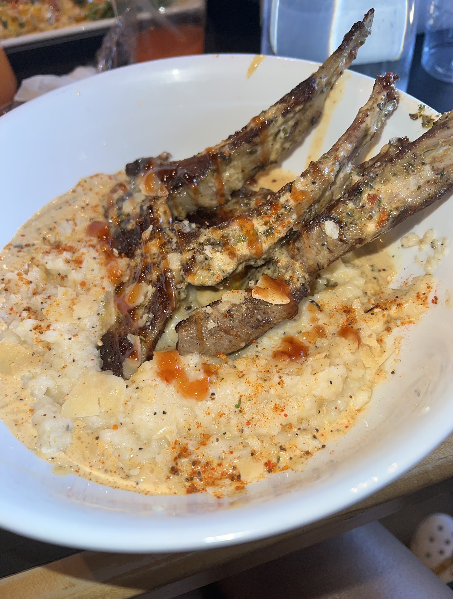 The wings and the pasta came out at the same time, which defeats the purpose of an appetizer. The wings had a good flavor, but way too much salt. The pasta sauce was watery and a bit bland, especially in comparison to the salty wings. It took another 10-15 minutes for the salmon to come out. The salmon was cooked well (not over/undercooked) and it had a pretty good sauce on top. The mac and cheese was better than I expected, and the broccolini had a good flavor.