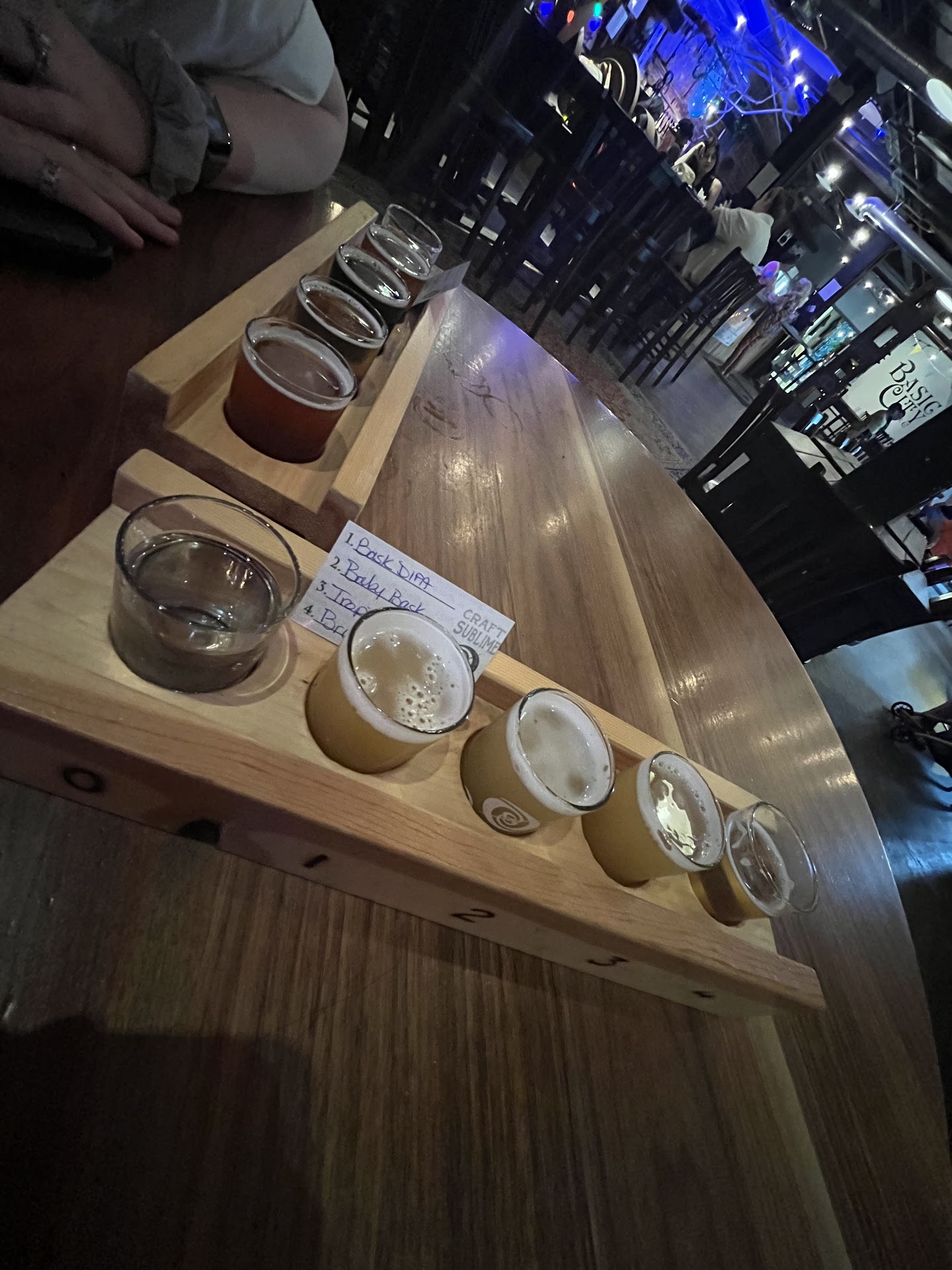 Now, Reilly and Tyler, those two young whippersnappers, they joined me for a tipple at Basic City Beer. We each had two beers, and let me tell ya, those brews were smoother than a buttered biscuit on a Sunday mornin'. Reilly had a stout that was so dark, it looked like it'd been brewed in the depths of Hades. Tyler, bless his heart, went for a hoppy IPA that made his mustache twitch with delight.