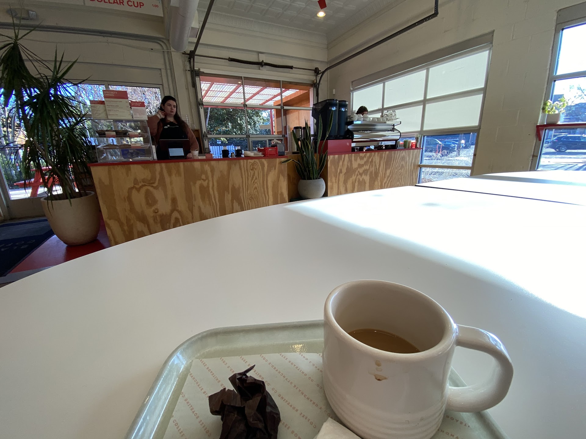 Read moreAnother former auto shop conversion. Great atmosphere, lots of sunshine coming in through the large windows. The aesthetic makes me think of Danish modern industrial. Cozy and inviting. The staff are nice enough. The coffee is excellent and the muffin delicious. Lots of locals hanging out and chatting, also quite a few take out orders. It was busy, but not overwhelming. There is a large community table in the main area, and a few smaller tables toward the back of the shop. The community table design makes me thing of a Kindergarten lunch/art table. An odd choice for a coffee shop, but somehow it works. Food offerings are limited to muffins, coffee cakes and cookies. No hot breakfast...