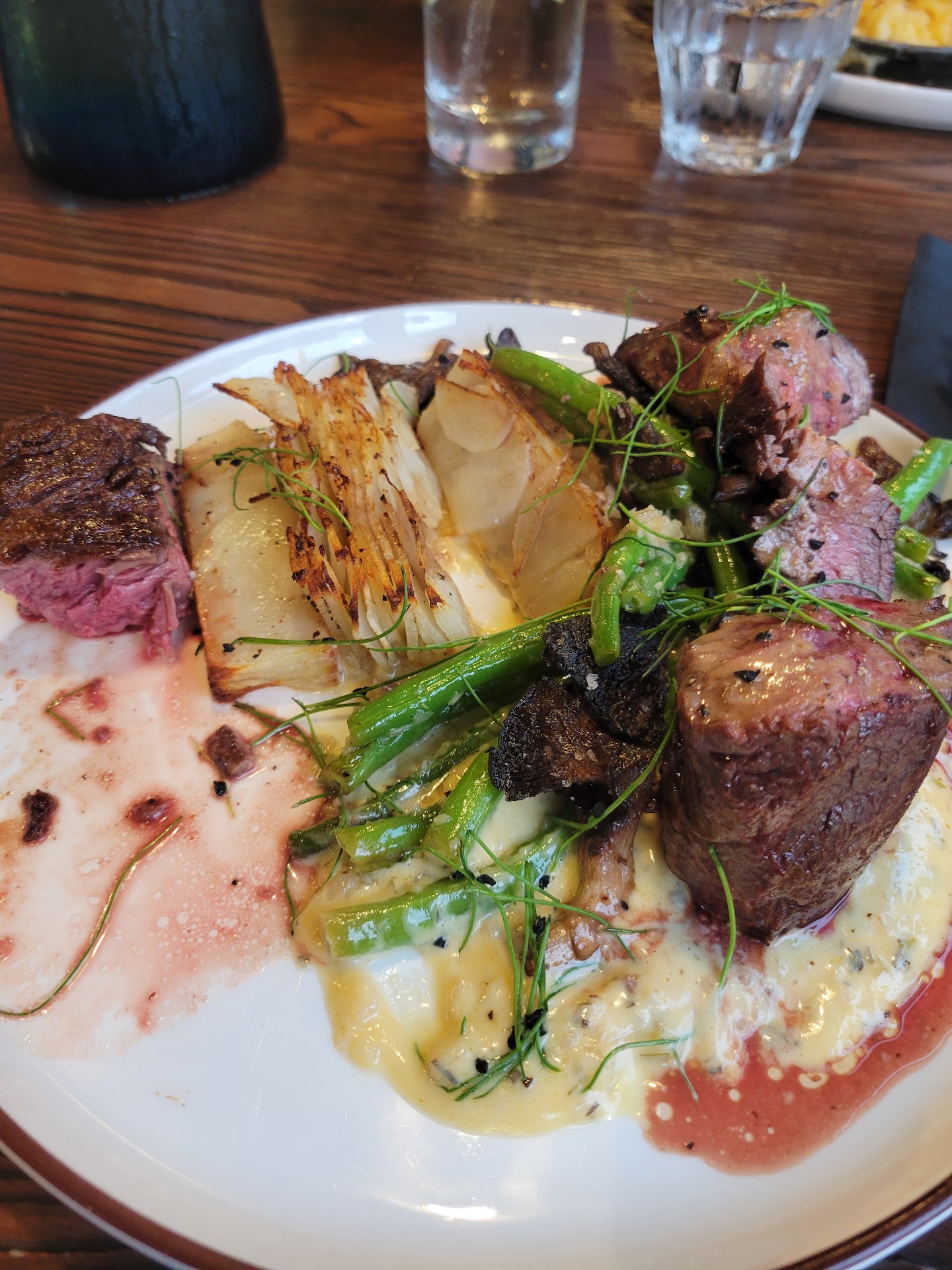 The quail? Gorgeous. Juicy, flavorful, and wrapped in a cherry reduction that made me feel fancier than I am. The herb-heavy stuffing was slightly overenthusiastic—think more “holiday potluck” than “Michelin finesse.” Potato aligot? Let’s just say it was more “mashed potato in a nice dress” than the dreamy, stretchy magic I expected. Broccolini, though? Chef’s kiss.