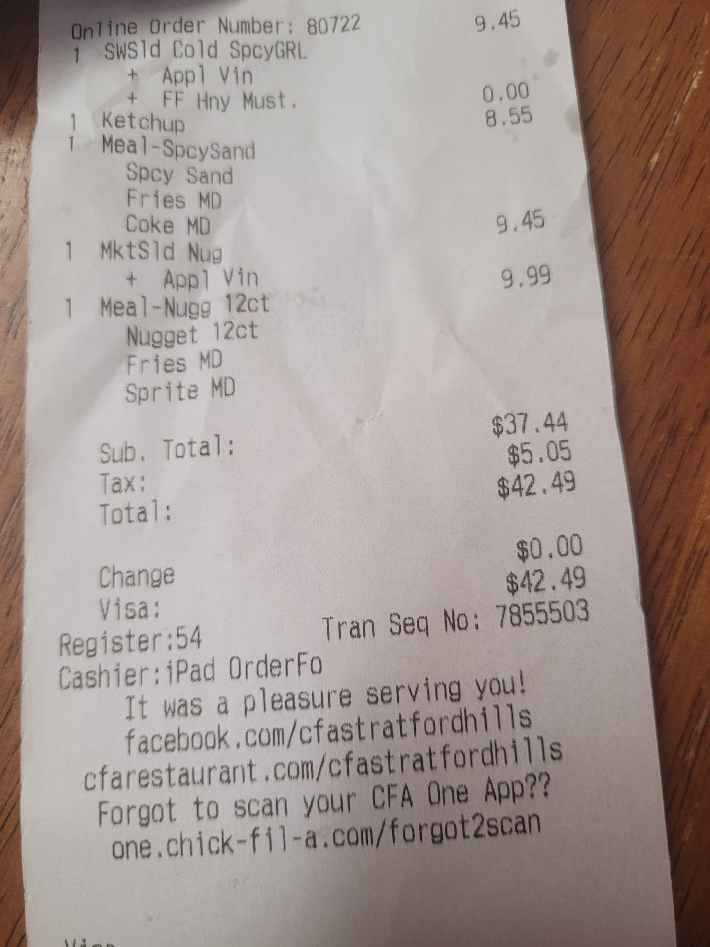 Read moreI have always loved Chick-Fil-A and never once had a bad experience. Not until this evening. And I am very very understanding of the fact that everyone is human and mistakes happen (I work in retail and customer service as well so I get it) and I typically don’t leave bad reviews but I was so frustrated after my visit today that I just felt the need to address it. I left work for dinner which the total trip should have taken me about 20 minutes, and I ordered my usual (8 count nugget meal with a coke) and rushed out to return to work. I didn’t notice until I got about halfway there that there was a hole in the bottom of my cup, causing coke to spill all over the Halloween costume I was wearing, and then I looked and noticed it had filled up my cup holders. Coke is sticky and gross. But hey, no big deal, I went back and got another one and set out again, at the light I reached for a fry only to realize they gave me two orders of fries. No nuggets. So for the second time I turned around and rushed back in to rude customer service and what seemed like nobody believed that I had actually ordered nuggets. They wanted a receipt which I didn’t have and made it into a much bigger deal than necessary. By the time I made it back to work I had been gone for 40 minutes and don’t even have time to...