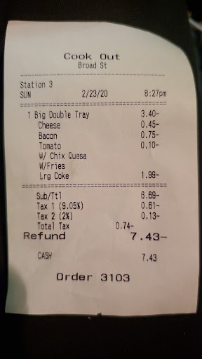 Read moreExtremely rude service. I came here on a late night drive passing thru town after I routed to Wendy's, big mistake. The place had a big line moving at a good pace, which is normal for cook out. After being rushed to order I arrived at the window to pay, the lady says nothing but the total. I pay and wait for my milkshake. As soon as I get my order the window slams shut; so I wait an wait as she ignores me in the corner of her eye. Then the window flies open an I get a rude stare no words or nothing, I ask for ketchup an she almost throws it in my hand most of it landing on the ground. A little shocked I pull up to park and eat in my car. After I opened my burger with a water soaked bun, I look over and realize I hadn't been given a straw for my shake. So I get out and go to the walk up window where I find a gentleman waiting patiently to be served at the window. I asked him how long he had been waiting, he said " a wile I've been knocking and they just ignore me and only serve the drive thru". I waited a couple of minutes an just go back to the car an finish my food so I can grab a straw when I leave. After I finish my entire meal with no drink I get out to go get my straw and the same man is waiting, I asked him if they took his order "nope, it's like i don't even exist". I left without a straw. If you want to get treated awful by rude staff and eat half fast food then go to this cook out. Imagine how bad they treat the food if they are that awful to the customers paying for their checks. I used to go to cookout in Harrisburg. They had a buncha young college kids with heart and soul running the place. You could really feel the love in their food and service, not this cookout tho...