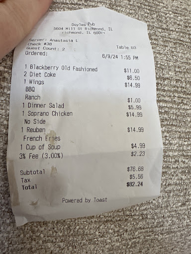 Ah, Doyle's, death by a thousand cuts. First, the food is generally good and the hired wait staff has always been friendly and on top of everything. That said I've heard rumors for years about the attitude of the owner and I finally got the experience tonight. To back up a bit over the past few years, first came the "card fee", even if you paid by cash. It was a deal to have the charge removed. Then came the "take out" fee, and then the "disposable silverware fee". Ok, nickel and dime me, I'll still chose occasionally to order out of convenience. Finally tonight, I got to experience the joy of The Owner. We walk in and ask if it's possible to place an order to go? She says yes, then proceeds to ask after each meal "Is that it?" like more than one meal is a bother (we ordered 3) Then she walks away without saying a word. Ok...a few minutes later she comes back with the bill and I offer to pay right away, so she was happy and polite then. I already felt bad taking an order out on a Friday night so I gave a 20% tip. Food comes out and she said "Ya know, eating here is so much better than eating out of Styrofoam". Yes, I know, but we wanted to get home after dealing with the death of an extremely close friend today.