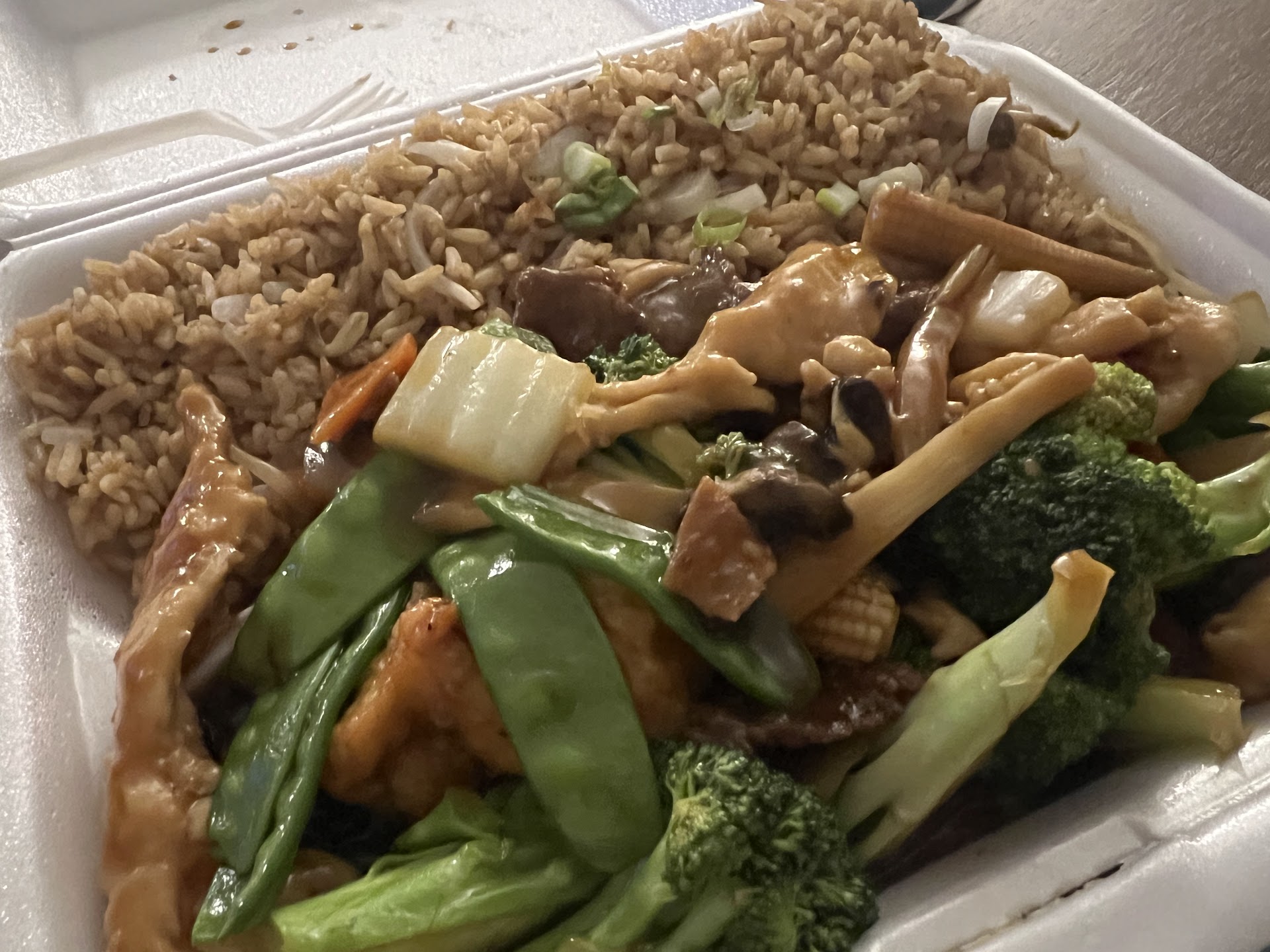 First of all let me say I love Chinese food. I bought from this place because the chinese restaurant near my house didn’t have a lot of flavor in their food so I came to this location. Unfortunately this Chinese restaurant is the same. I ordered 2 dinner specials,sesame chicken and sweet and sour chicken with fried rice and pork egg rolls. The food was bland and not a lot of flavor in rice or egg rolls. The duck sauce was also bland. Only the chicken had flavor. One plate was for my mom and she agreed. I had high hopes for this restaurant because all the positive reviews and I was contemplating on coming here for weeks and the food was not nasty not delicious just okay. The sweet and sour chicken had a cup of sauce while the sesame chicken was cooked in sauce and had broccoli in it. I mixed my sesame chicken and rice together to flavor rice with chicken and the sauce. They should pour the sesame sauce over the rice to add more flavor instead of serving plain rice with onions. Stop being stingy with the sauce. I caught the bus home and got there almost 2 hours later at almost 8pm on a dark cold night and the food was still very hot. The people here are hard working and nice so i’ll hate to give negative reviews. I feel as if the cooks was rushing thru orders to be done quick. There was only like 2 or 3 cooks and 6 people in line in front of me. The cashier lady taking orders said 30 minutes and it was here at like 15 minutes. I’ll be willing to wait longer for more flavorful food. I’ll give them another try and order something different the next time. The service was good but the food was neutral,so I gave a neutral review. 3...
