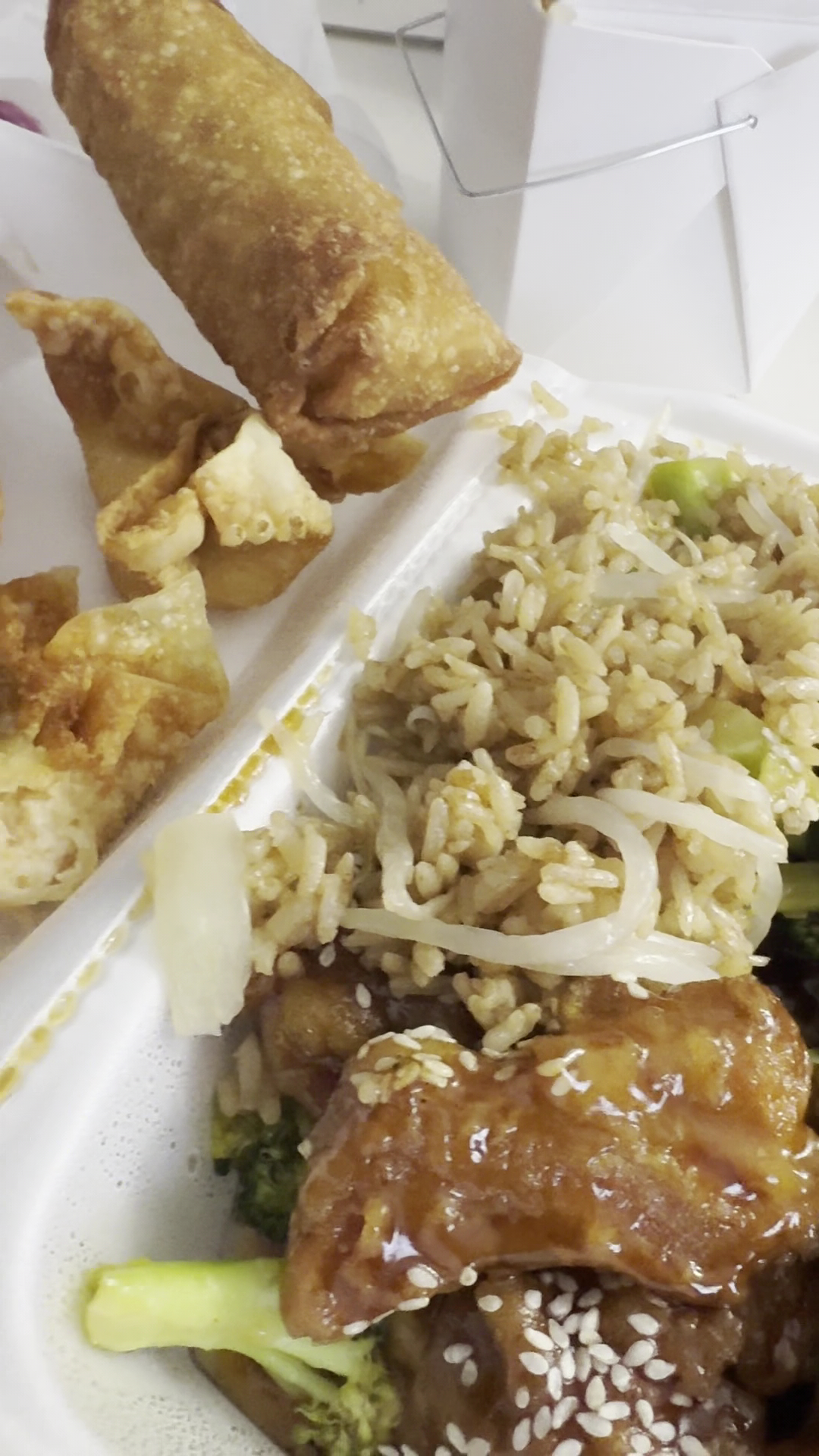 Firstly, she gave me two extra shrimp eggrolls and 3 of their very large crab rangoon things. The shrimp inside were huge, the eggrolls themselves were huge, and the crab rangoon were made fresh (and didn't look like standard crappy ones).
