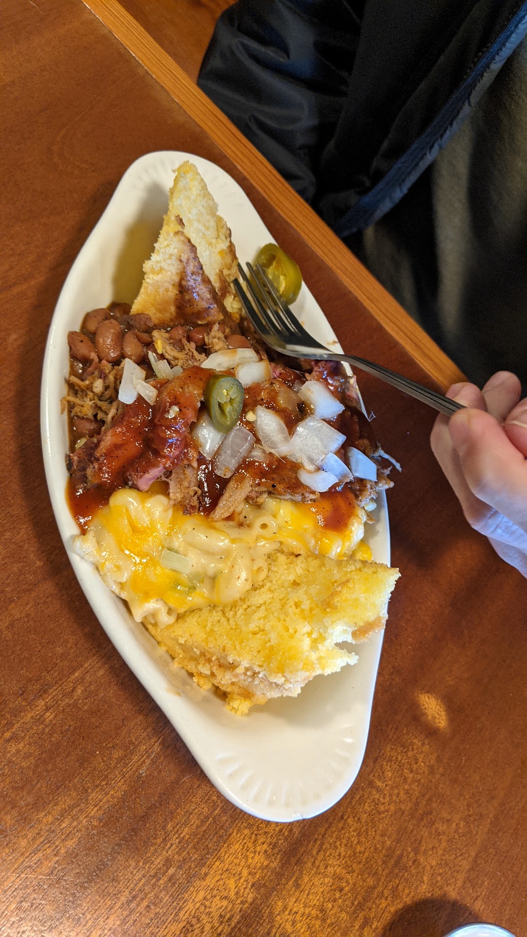 Our waitress was attentive and she double checked our orders when she gave them to the "kitchen". My boyfriend ordered a Texas Trainwreck (BBQ on top of jalapeno mac n cheese with cornbread, onions, beans, and two slices of jalapeno), and I got BBQ nachos. We both opted for "pulled" pork.