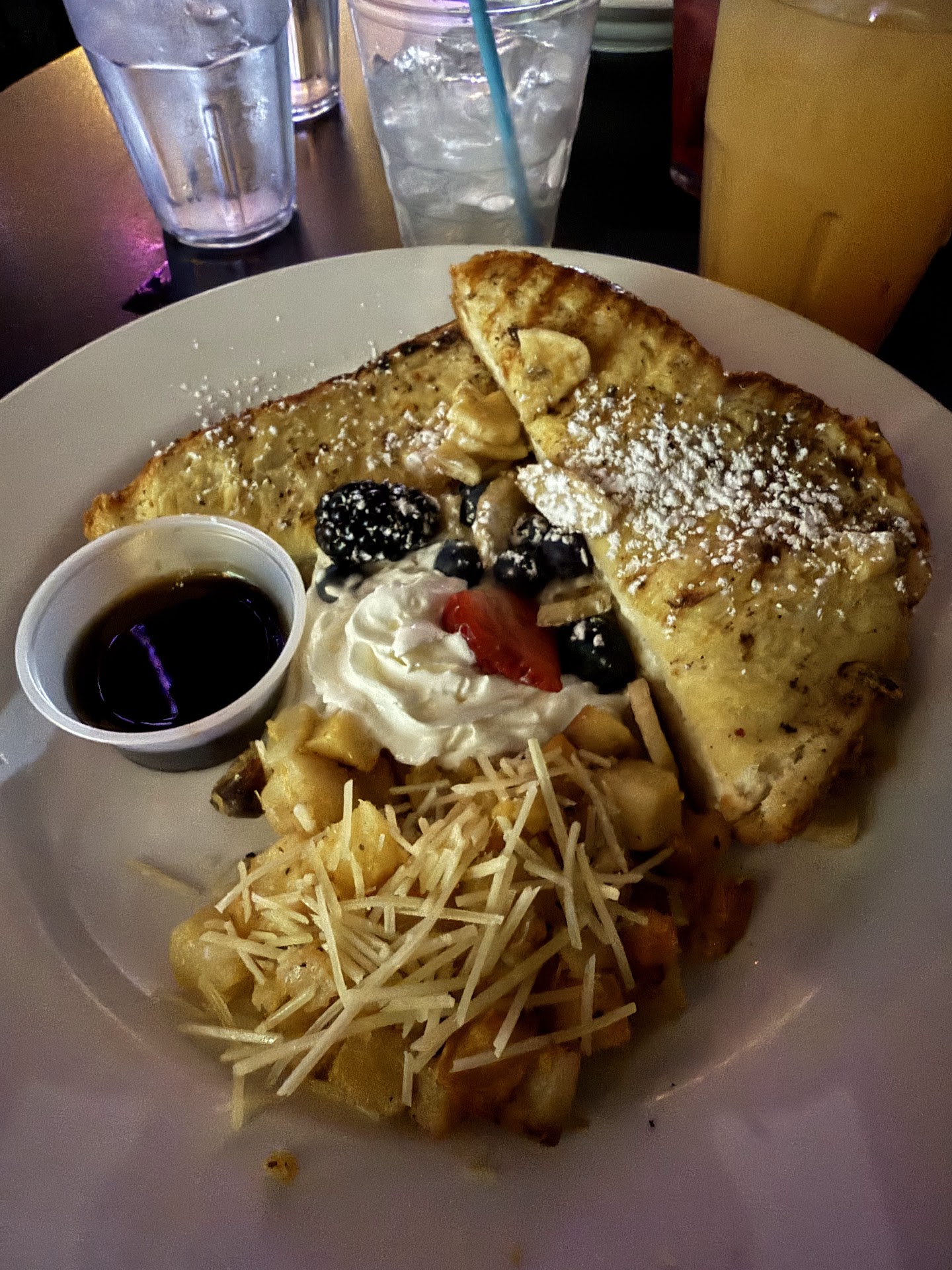 For food, I ordered the banana-stuffed French toast, which was delicious. My friend had the steak and potato salad but wasnât thrilledâthe steak was overly fatty, although the rest of the salad was good. Keep in mind the food is cooked by a three-person kitchen, so the wait time is significant. We ordered at 2:15, got our food at 2:56, and there were still diners waiting for food well past 3:55.