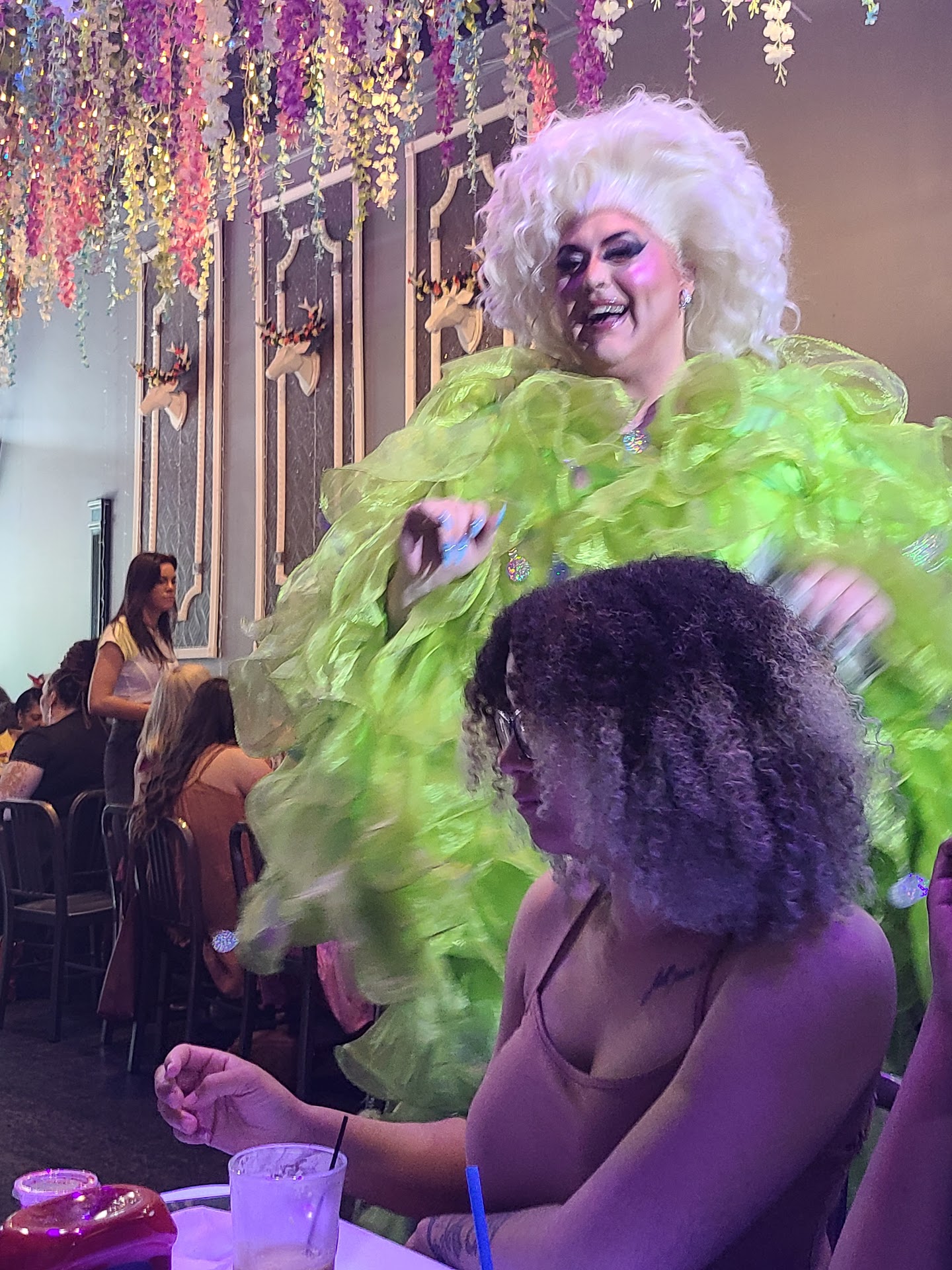 I appreciated the MC mentioning how the food takes a minute because it took well over a minute. Food got 2 stars because of how long it took (many other tables got theirs first and were finished eating by the time we got ours; we got ours well about 70% of the way through the show) and because it was average tasting- it was not worth $33 (wouldnât have paid that had I known the prices earlier too; they were not on the menu to my knowledge, but I couldâve not looked in the right spot). Would rather them have done a buffet style service in the other room that attendees can go to with one flat rate (I attended a drag brunch that did that and enjoyed it much more since I wasnât hangry).