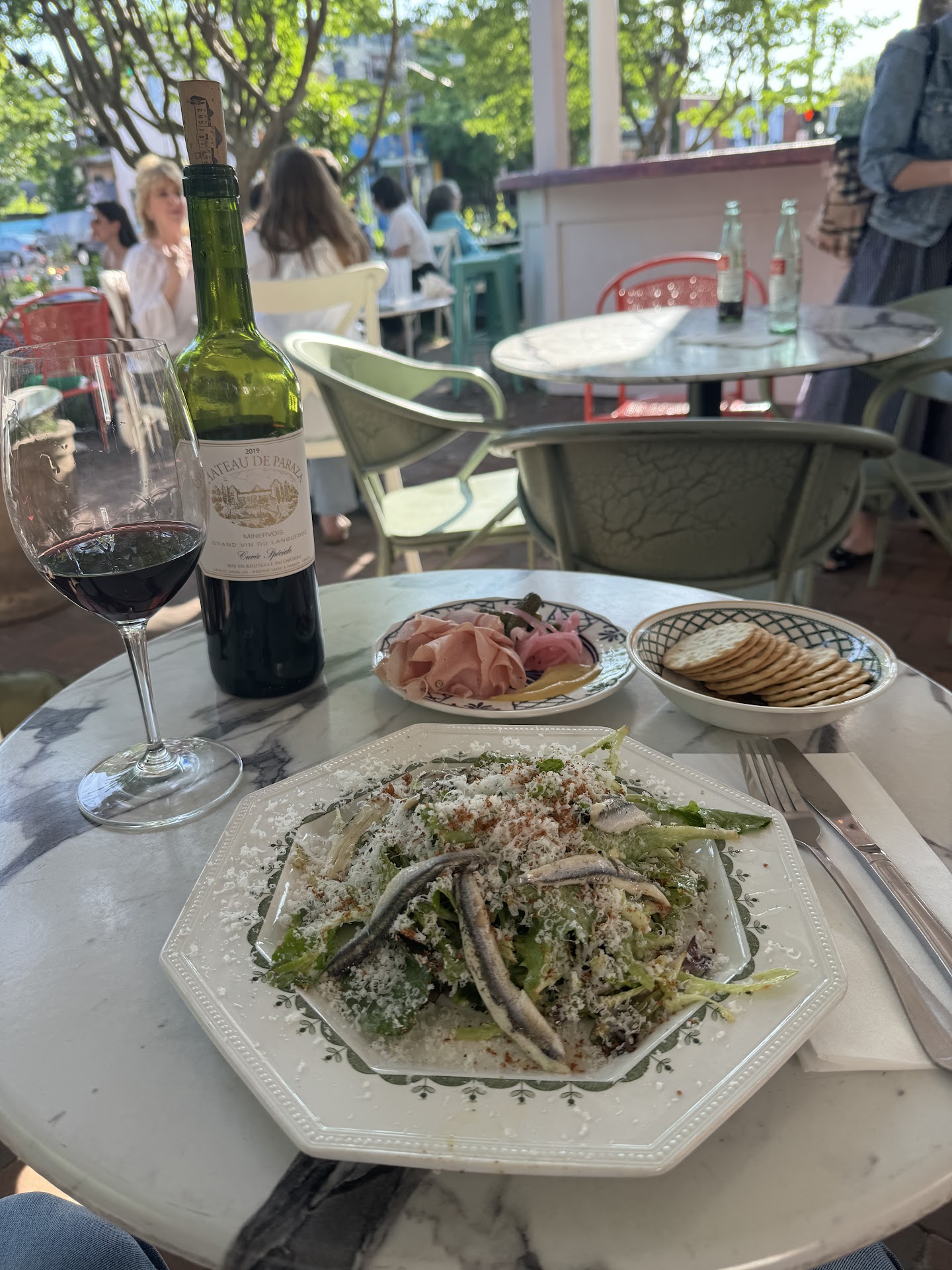 I got the Caesar salad, mortadella, marinaded olives, a bottle of red (Chateau de Paraza 19’) and a white (Cazas Novas Avesso 22’). Not only was the food to die for, with the Caesar being my favorite, if not one of the best Caesar salads I have ever had, and the marinated olives being borderline heavenly; but the wine was unique and delectable.