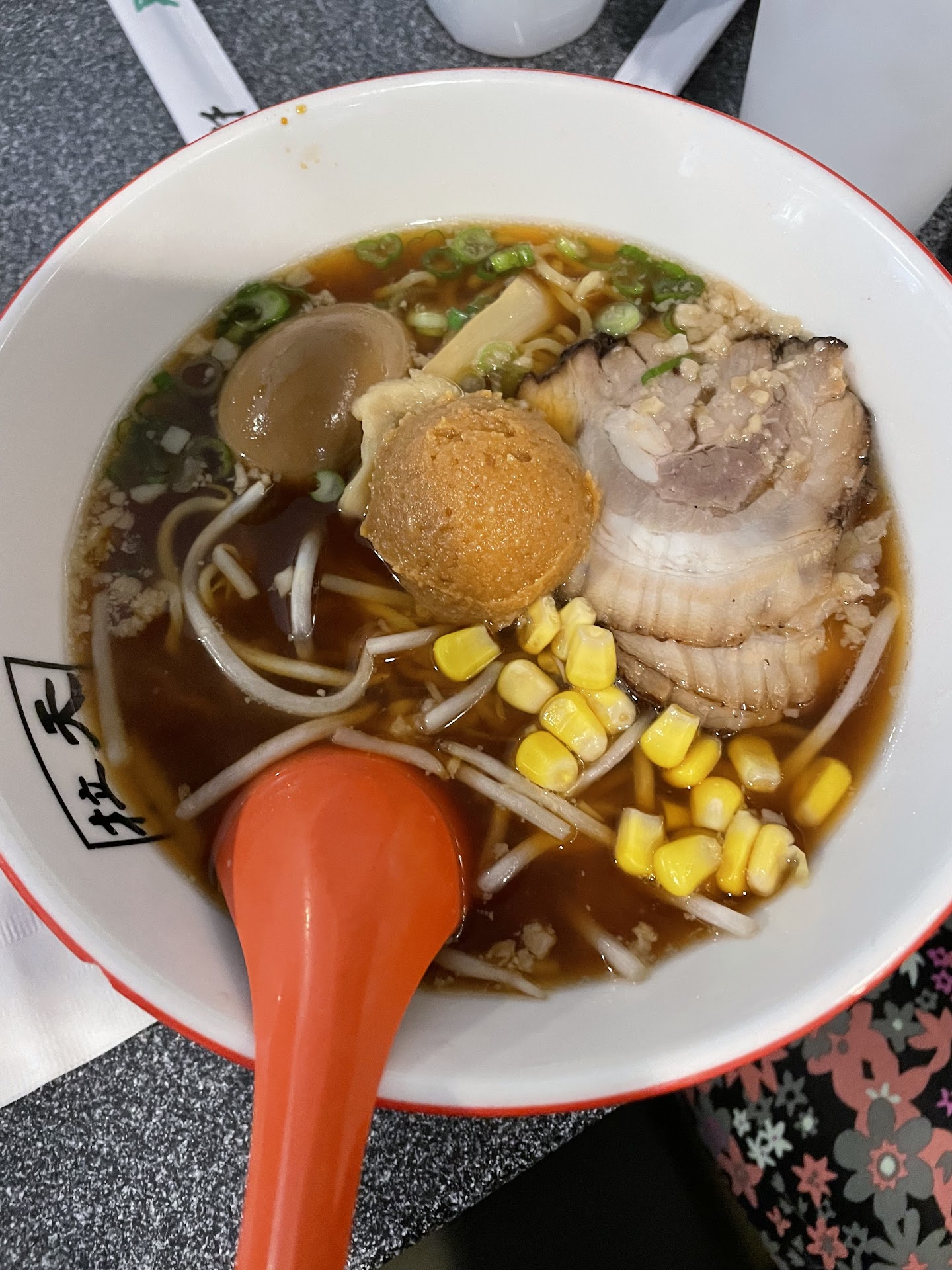 I ordered takoyaki and spicy ramen and added corn ($1) and nori ($0.75). $0.75 for two small pieces of nori felt a bit steep. My friend ordered the chicken karaage and pork bun. The chicken karaage just tasted like regular chicken nuggets, and the pork bun had shredded pork in it. I didn't try it. The takoyaki I had was ok - it wasn't piping hot on the inside like I'm used to and tasted more like batter than octopus.