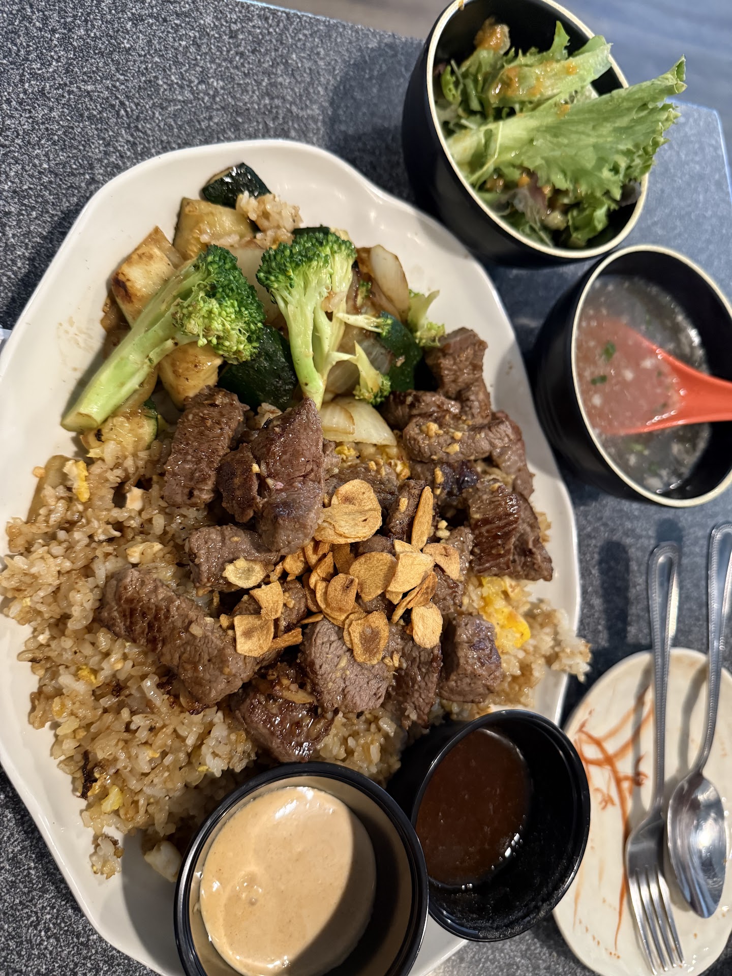 Pros: The hibachi is definitely a standout. I ordered the dinner portion of the garlic beef hibachi, and the flavors were well balanced. The rice and vegetables mellowed out the boldness of the garlic beef. It also came with a fresh salad and a comforting bowl of soup. The yumyum sauce deserves a special mention: its creamy, sweet-savory profile really brought the dish together.