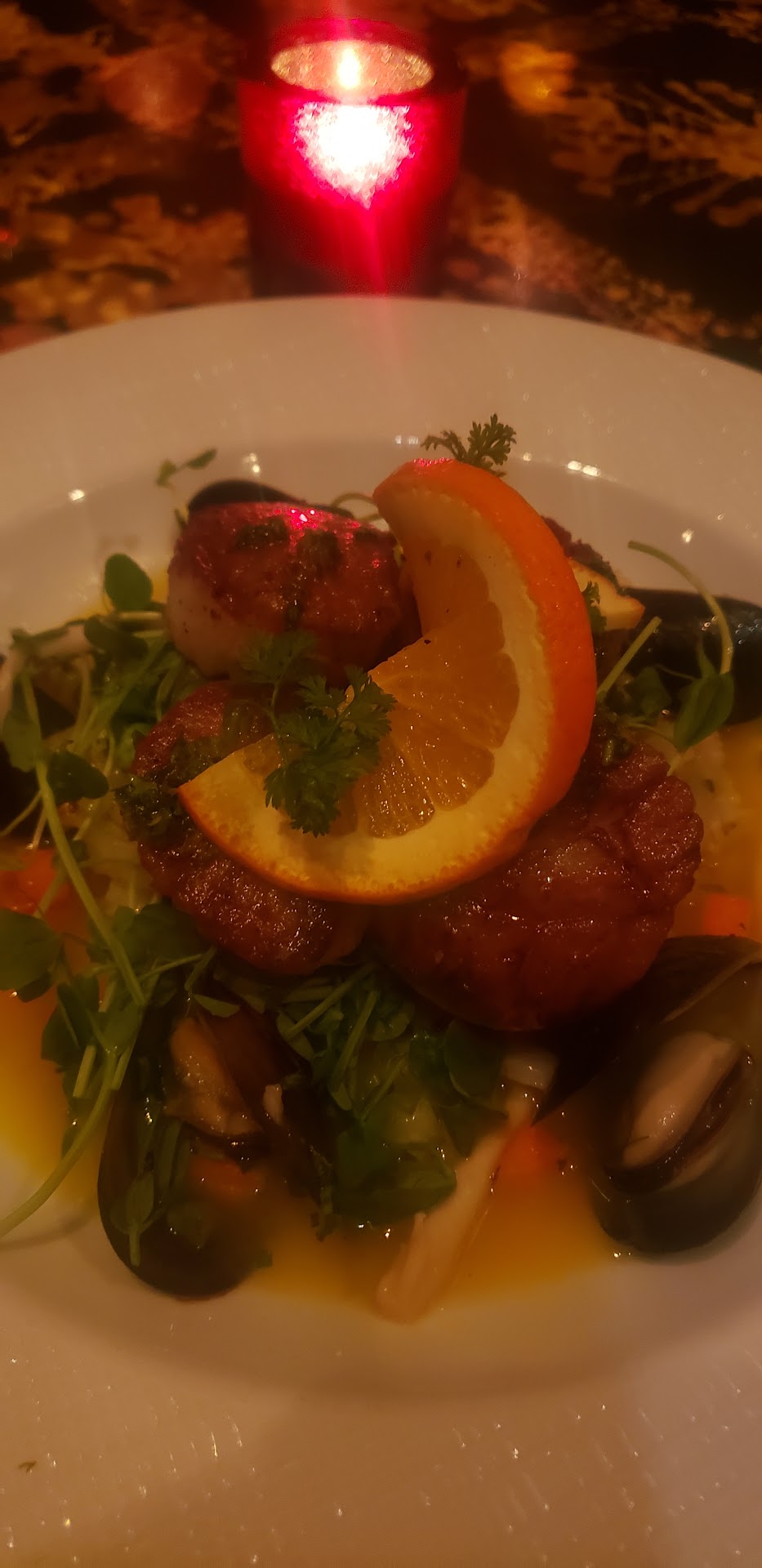 My entre appeared quickly thereafter. It was presented well and looked delicious. The orange with rind on top was strange. I tried the broth first, it was good. I removed the meat from my mussels and dug in. The mussels were cold. I could not cut through the scallops with my fork. Thus the previous presentation of the steak knife. Parts of the scallop were overcooked and parts were under-cooked. The vegetables and greens were not cooked and raw. Exception being the peas. The peas were cooked perfectly. The carrots were of high quality, but not cooked. The consistency tasted like the raw baby carrots I give my child. The greens on the entre were still on the stem and seemed thrown onto the entre. The onions were raw and undercooked. Imagine an under-done saute. The FLAVOR was EXCELLENT, the COOK, was RAW.