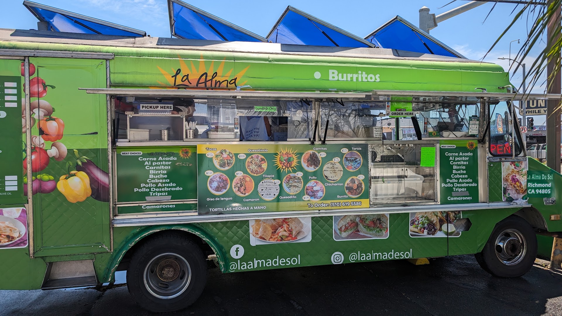 Yum! A real cross-section of Richmond and beyond returns here for quality menu hits and the standards you expect from a food truck. The tacos de asada are a can't-go-wrong classic and I appreciate the mix of carrots, radishes, onions and peppers that complement each dish. Fully eat the quesadillas while they are warm; don't save to reheat this selection, as it's cheese is much better freshly cooked. The quesabirrias hit the spot for me, too! I like the horchata the best of the aguafrescas that are all refreshing and not overly sweet. I like the doradito light-browning of some of the food selections, and the salsas are very tasty - I like the green sauce the best. The staff members are keen to make the food as you like it and aim to get your meals to you with efficiency and a smile. They care! Many people return here from what I've witnessed. The corner can be a bit windy on the straightaway from Civic Center to the West, but on a sunny day it can be great to borrow part of the bench and table to eat by the tropically-colored and decorated food truck. Some people choose to carefully dine in their cars for warmth, too, somewhat like a drive-up diner. My friends and family and I will see you at La...