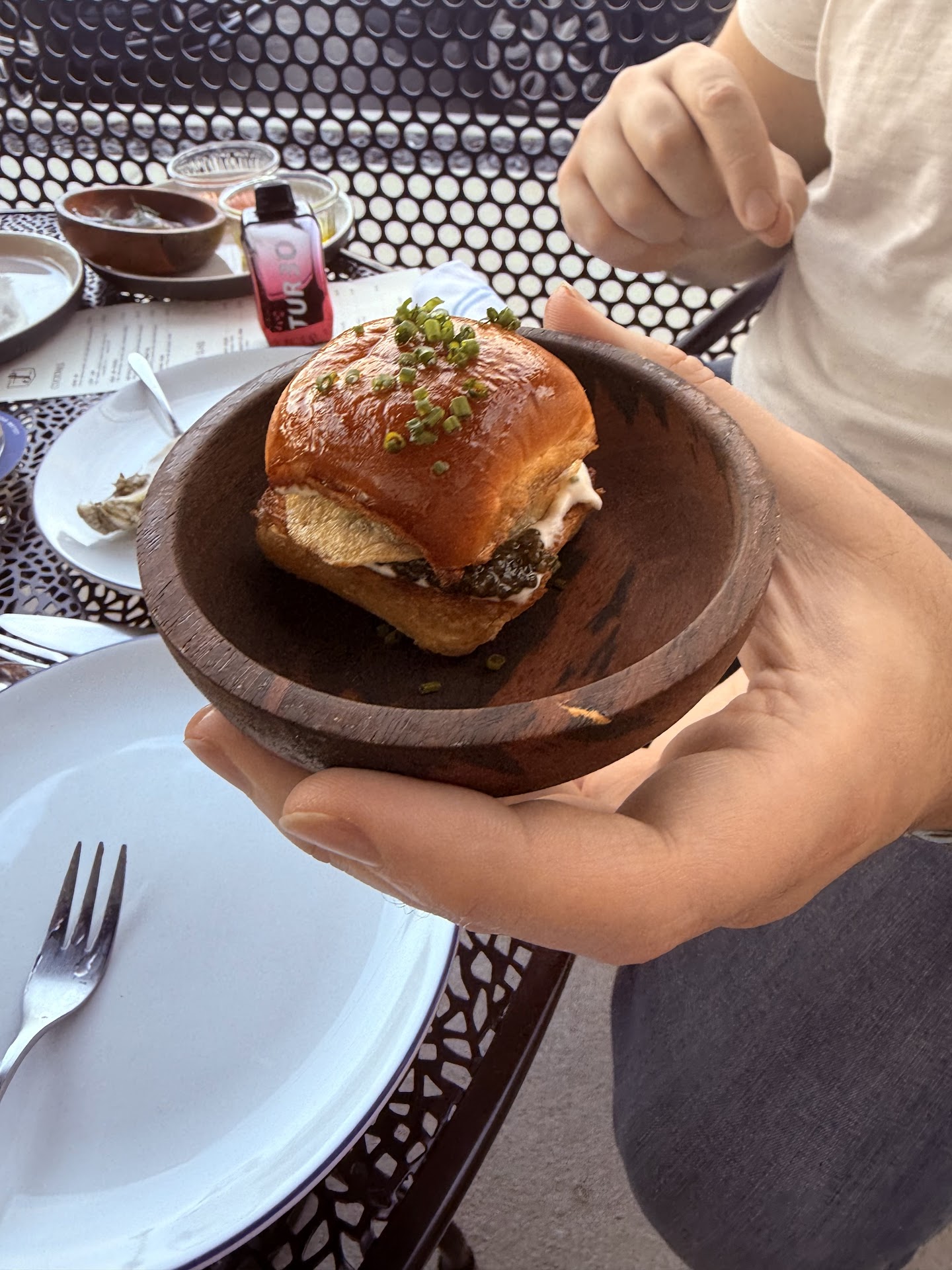 EUPHORIC. I left Lillian feeling seriously elated, as though I'd been allowed a visit to another world--one where beauty, artfulness, and an exquisite palate are at the center of its operating principles—offering a first-rate, unique restaurant intentionally designed to create an exceptional experience. No detail of the decor has been left unconsidered: from the chunky slabs of sage green quartz on the long bar to the intimate, low-key lighting that made every dish and glass glow, the space is an inviting field of calm and wonder. If the atmosphere is a field, then the dishes are wildflowers bursting forth in a riot of color, scent, and texture. The roasted oysters are juicy and full of briny sweetness, topped with crunchy, buttery breadcrumbs. Under a spicy powdered topping, the peel-and-eat shrimp are served on a bed of ice, giving them a firm and tasty foundation. The warmed homemade sourdough bread is perfection: crispy on the outside with a tender, spongy inside, served with a splash of butter topped with salt flakes. I felt the Hamachi Crudo’s subtle yet complex amberjack umami all the way down to the soles of my feet. And the desserts! The sourdough ice cream with butterscotch topping sprinkled with cocoa nibs had my husband leaning over the bar gushing praise to its creator, while the velvety chocolate tart topped with toasted shavings of coconut paired with sharp lime zest and caramel was everything I never knew I needed. Plus, a tasty prosecco on tap. Do yourself a favor: take a trip to Lillian, ready to let the chefs guide you through a journey of imagination...