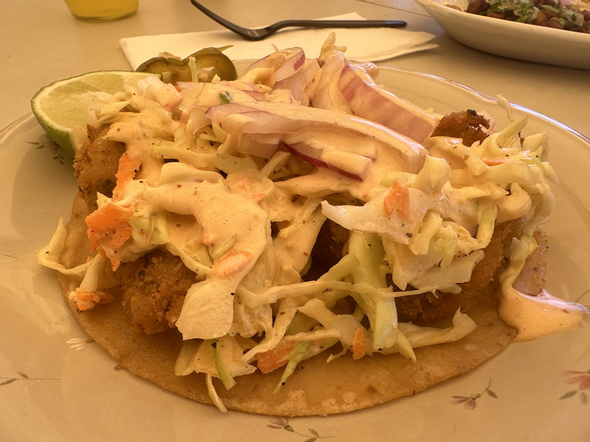 Gotta get seafood. Itâs in the name of the business. I had one shrimp taco and one fish taco. Both proteins were fried and breaded with an ample amount of slaw on top. Really good flavors. I preferred the shrimp since the texture was nice and bouncy, but the fish was good too.