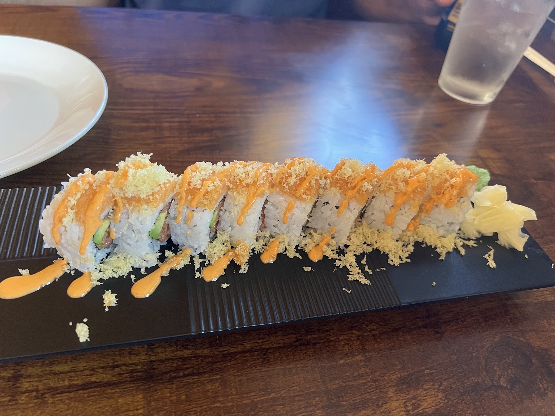 Then the rolls came. My Kani roll, despite the menu not mentioning it, was half avocado. Meanwhile, the Spicy Salmon roll (which does list the roll as having "crunch") was mostly crunch on the inside. It was like someone took tempura breading and blended it with the smallest amount of Salmon and aoli. I realize these are cheaper rolls than the chefs special, but for the same price I could have gone to whole foods and gotten something better out of their refrigerator. But fine. I'm determined to have a good night. I won't let this bother me.