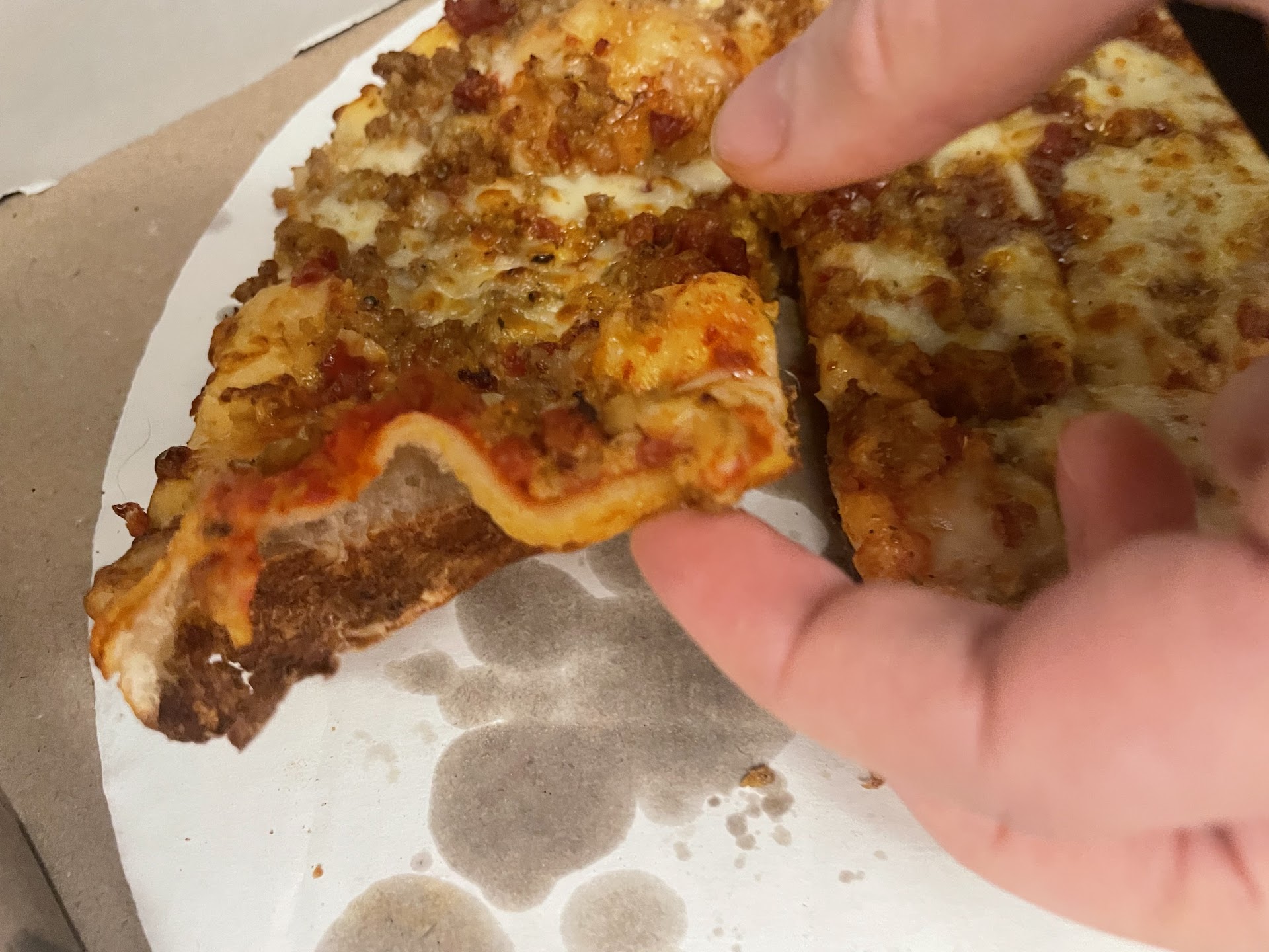 The past few years between 25-30% of the time that I order delivery( including last week on 12/22) see pics.. , the pizza arrives with half the pieces having a thin, hallowed out & bubbled up crust. I don’t know what causes this..I would assume it has something to do with temp & humidity? In any case, I can’t be the only one having this problem for several years now.. case in point, Not worth what you pay for…plus I ordered full bake breadsticks and half the time they are pure dough that I have to end up baking myself.
