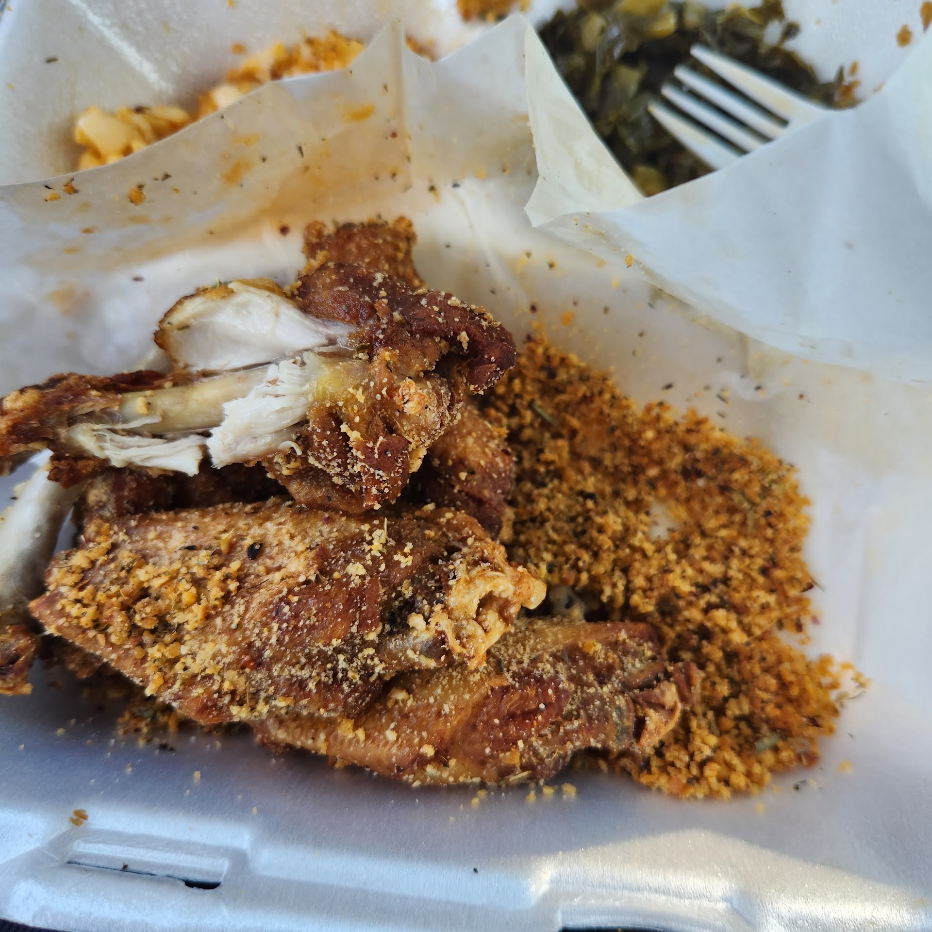 Read moreI ordered Macaroni & Cheese,JeMaes Collard Greens, and Wing Flavors: 6 Garlic Parmesan. The mac and cheese and greens were good but not phenomenal. I had them once; I never have to have them again. I wouldn't pay for them again, and I wouldn't drive across town for them again. However, I would eat them again, so I would say they're just slightly above mediocre. The chicken had a decent flavor, but for my expectations, it was terrible! I'm not familiar with these dry crusty crumbs as "garlic parmesan," I don't see how this is a hit. I think people are lying to you, and they're afraid to tell you that this style of flavoring is trash. Well came...