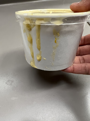 Lupita scooped the soup into the cup, noticing that some of the soup spilled over the side of the cup, Lupita did not wipe off the mess she created. She placed the cup of soup into the bag along with the sandwich. She did not ask if I wanted lettuce, tomatoes, or any extras on my sandwich.