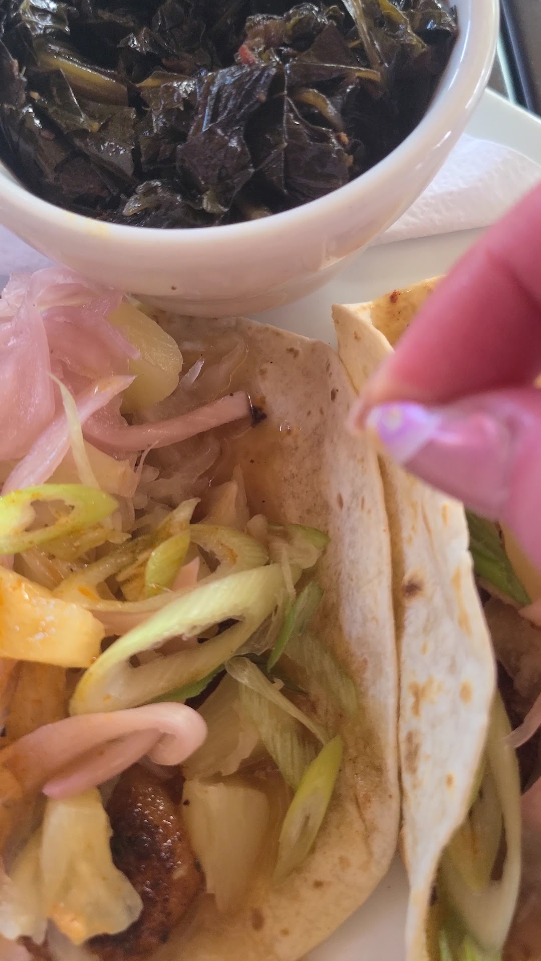 Came in last week around 5ish for dinner and sat on the patio. There were good and bad parts to our experience. They had some solid happy hour options, for both food and drinks. It did take us a bit to get drinks at first, due to some miscommunication with our server. We waited for about ten minutes after being sat with waters before going inside to ask our server if we order inside or not, and she told us she was waiting on our third person to get there. Totally understandable, but we didn't get checked on during that time and she seemed a bit annoyed at having to come outside. We ordered happy hour drinks and deviled eggs (traditional style, they change regularly according to the menu!) and garlic parm rub HH wings. Everything came out quickly and was enjoyable. The wings were huge, but we probably would've gone with a sauce next time. Our server seemed to start warming up to us when we placed our entrée orders, despite the initial irritated attitude. We got the devil's triangle hot chicken and the blackened fish tacos. The hot chicken and sides were really good, and a really hefty portion as well. The Mac had a wonderful creaminess to our and the collards were a standout- a little sweet along with the savory. The fish tacos were really good as well, but I had to send them back. There was a hair sitting on the side of one of the tacos, which like whatever, things happen, I just picked it off and went about it. Got through most of one taco before I spotted a second hair, this time more embedded in the taco. I sent them back and got the turkey ruben to go (not pictured) which was pretty good when I reheated it at home. Decided to try the cherry pie with vanilla ice cream for dessert. It was decent, but again we had to send it back after a few bites when we noticed a spot of mold on it. Luckily none of us got sick afterwards, and our server was super understanding and she took it off the bill for us. After closing out, two of us stayed for awhile to wait out the storm that had started up, and our server was kind enough to let us reopen for a couple more drinks while we watched the rain. The bar itself has a real neighborhood watering hole vibe to it, and you can tell that there's a lot of friendly regulars who hang out. I'd probably come back to drink again, but wouldn't order anything to eat if...