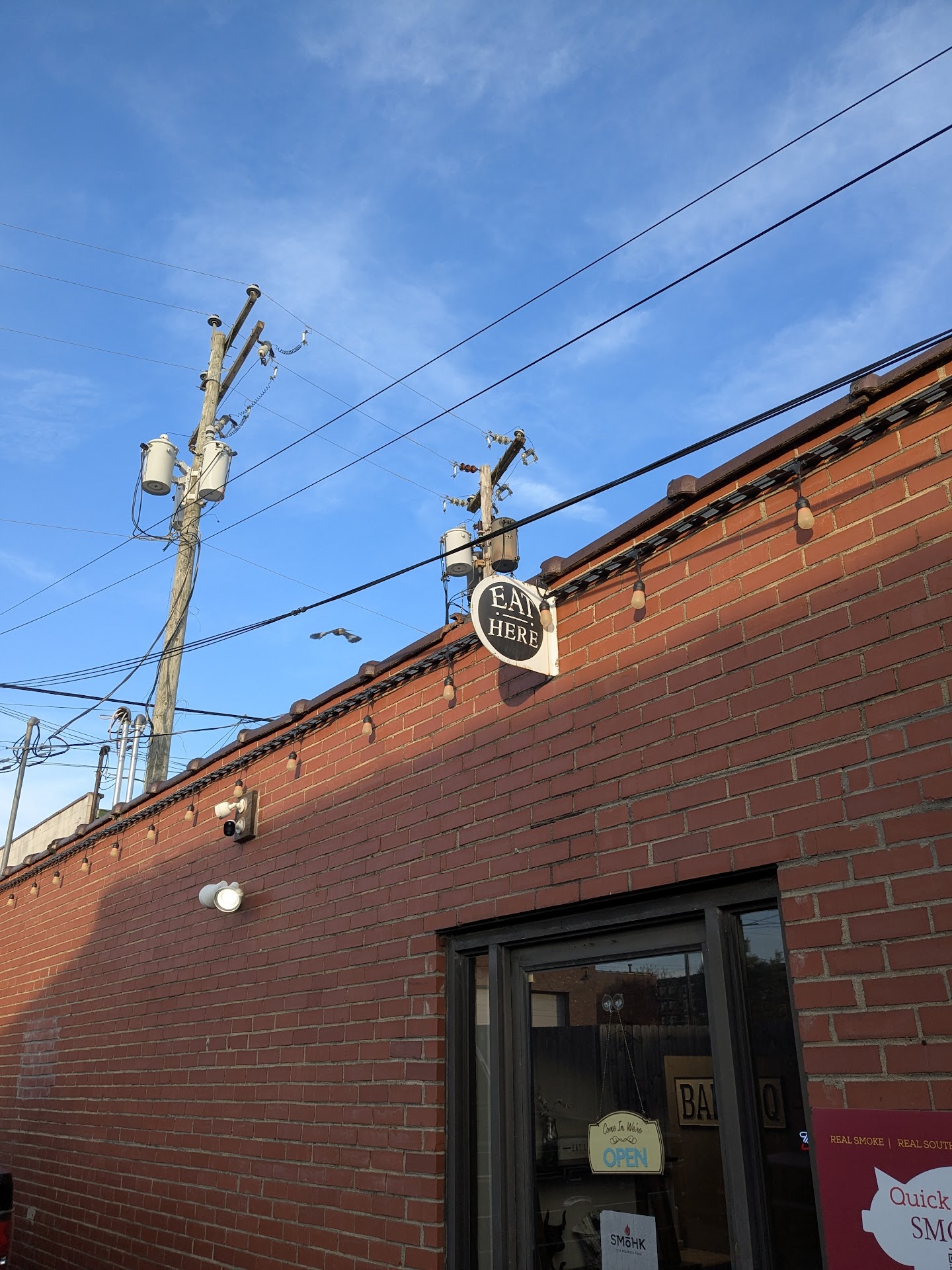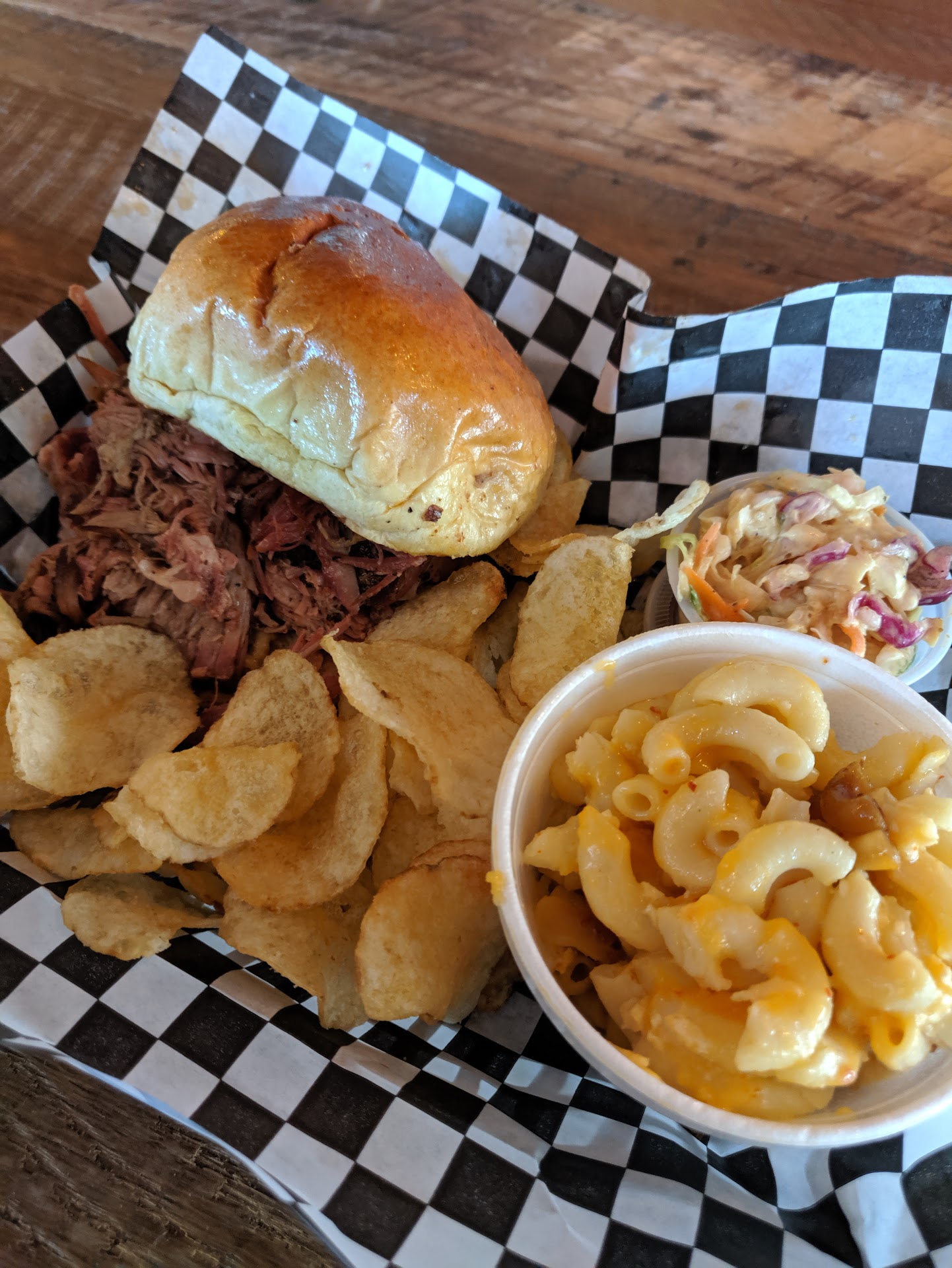 I walk in. Joint literally looks like a storage room that was converted by the brewery into a BBQ joint. I can easily smell nothing but BBQ. This is the right way. Roll up. Guy is sitting at the register, bins on racks next to the register. You can see half the kitchen is half the store room. Hell yeah. I'm country enough to know what's going on. Ordered a brisket sandwich and the smoked Mac n cheese. Took it outside with a Mexican coke as the rain started. Sat under an awning and dug in. Absolutely fire. Brisket is tender. Good bark. The smokey apple BBQ sauce is done right. Smoked Mac n cheese is a fat boy's wet dream. The brewery had live music playing. Rain was falling and all I could smell was BBQ and campfire and the smokers are still lit. SO much nostalgia of backyards as a kid around the bonfire or at the neighborhood bar.