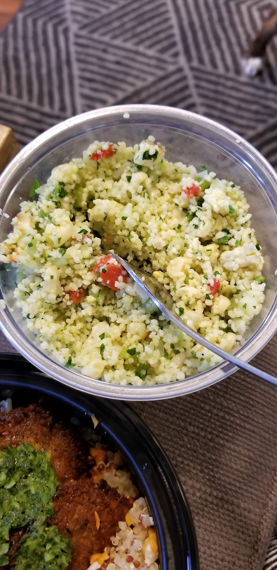 Read moreI'm always excited with a new restaurant opening within walking distance. I'd been curious about the concept since it was announced last year, and went to stop by on opening day to check it out. On the first trip, I picked up a falafel bowl, golden curry w/rice, their Bangin' Pimento Cheese, and a Nutella strawberry shortcake bar, all for less than $30. Everything was delicious. We housed the container of Pimento Cheese in days. Went back today to get dinner for tonight and lunch tomorrow. Pictures are of the gluten free/vegan quinoa falafel bowl, and roasted sweet corn and cous cous salad. Also had the Greens, Beans, and cornbread. Lunch tomorrow will be the BBQ chicken, collards, and cornbread for me, and the Taco chopped salad for my partner (which I really wanted for myself, but maybe next time!). Again, these 5 items were only $30! I'm really grateful for their presence in the neighborhood and look forward to all of our...