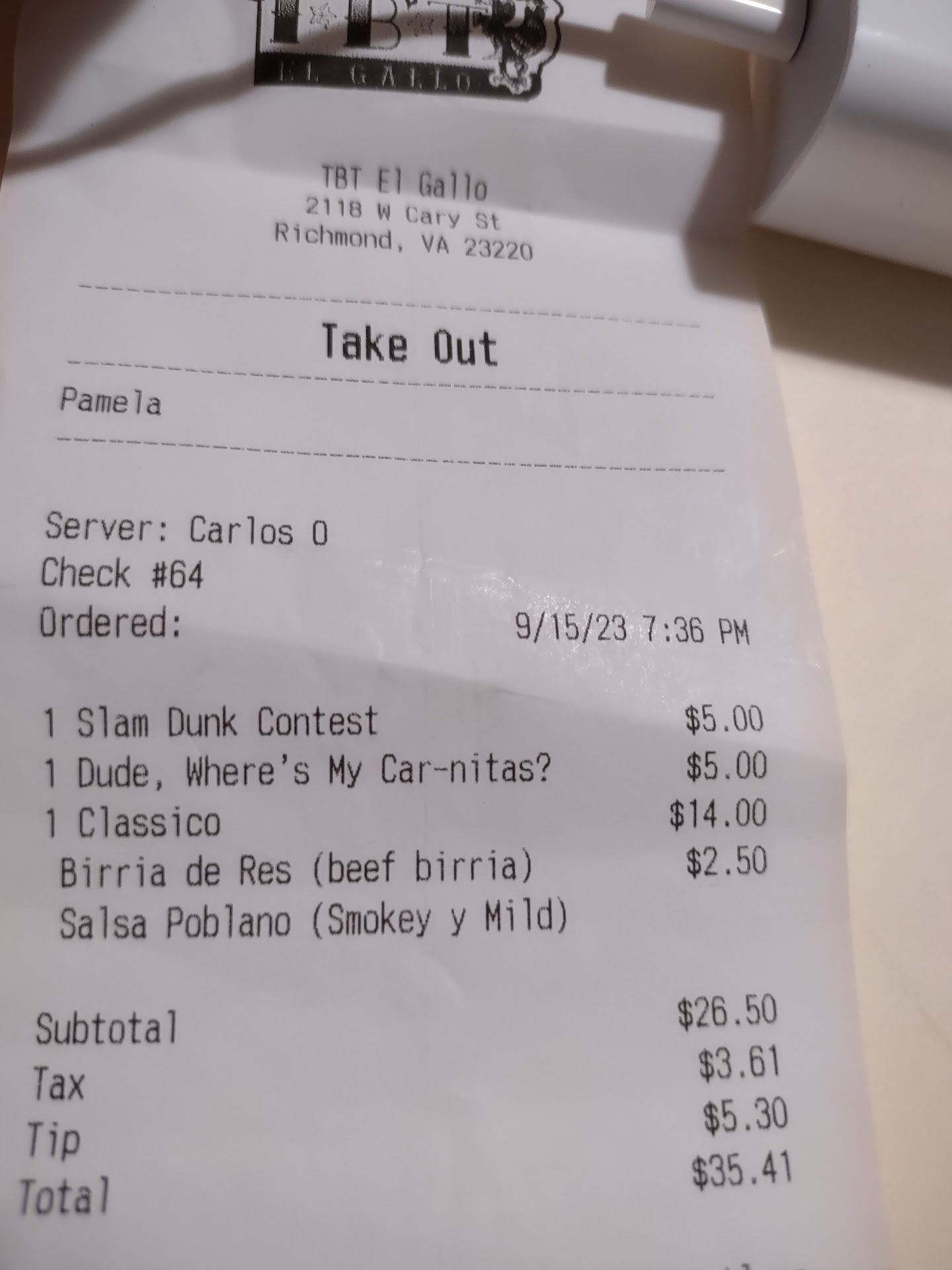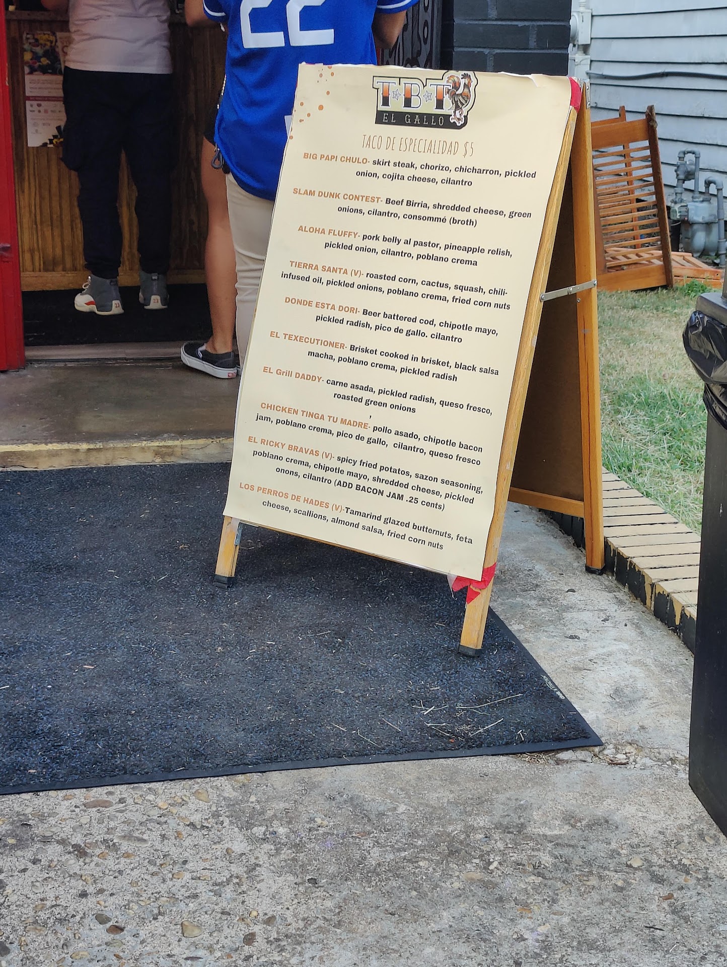 I'm so disappointed!! I hate when I have high hope's for food that reviewer's hype up, and my experience significantly differs! My friend and I were starving, after leaving the 2nd Street festival. (food line"s were insane) I suggested El Gallo, since I'm a taco "aficionado" and the IG photos looked good. The place is located in the old Naked Onion, some of the best food I have had. I thought that was a good sign. When we arrived they were busy, but not too bad, until we placed our order. It appeared that they immediately became overwhelmed! I ordered 5 different taco's, I wanted to try them and share with my son. I ordered the big papi chulo, where is Dori, aloha fluffy, chicken tinga tu madre and the birria taco. My friend ordered three tacos similar to my order. The only changes I made to my order was no pineapple on the aloha and extra cilantro. I didn't think my request was outrageous, apparently it was, lol. I have never been to a food truck, restaurant or anywhere that it takes over an hour to make taco's ( even specialty taco's). We watched and waited as others ate and were served. Also, they are not responsible for the outdoors seating ( I didn't quite understand that). It was taking so long for our food, that I ended up going back in to get updates. (They have a wack ordering system) Finally, I get my food and if I hadn't been so hungry, ( my sugar drops) I would have asked for my money back! I have had some bad taco's in my life, but these were hands down the worse! Primarily, either they got my order wrong, or all the protein tasted dried out, overcooked and bland. When they noticed that they were running low, they should have stopped taking orders to make sure the ones that they already had were completed accordingly! These are not Five dollar taco's! The meat was over cooked, they ran out of cilantro (Mexican place really???) I hate when that happens) and not only were the shells half empty, heavily camouflaged with garnish, They got the entire order wrong!! My friends order was completed in 2 hours, after numerous requests and she choked on her's! We couldn't figure out what taco was what! The alleged pork belly in one of my taco's was just 1 small bland hard strange shaped cut of meat. My son ate what he could and discarded what he couldn't chew, or think he could digest (which was almost everything.) I bit into what I thought was the birria taco, because I was about to pass out and almost damaged my dental work. They piled a bunch of garnish sans cilantro, on the tacos to camouflage the lack of protein, oy vay! My friend threw all of her food away! The place had gotten busier and out of control, they were running out of ingredients it wasn't worth it to complain. This is a small place that is not accustomed to handling heavy traffic. Chef's and cooks, as a famous Chef Gordon Ramsay always says, "When cooking always taste your food!" When I eat any food especially ethnic food, IT MUST BE SEASONED!!! Also, don't overcook your protein, and label your containers with the order details!! Be prepared for larger crowds! Anyways, we won't be returning, I need...