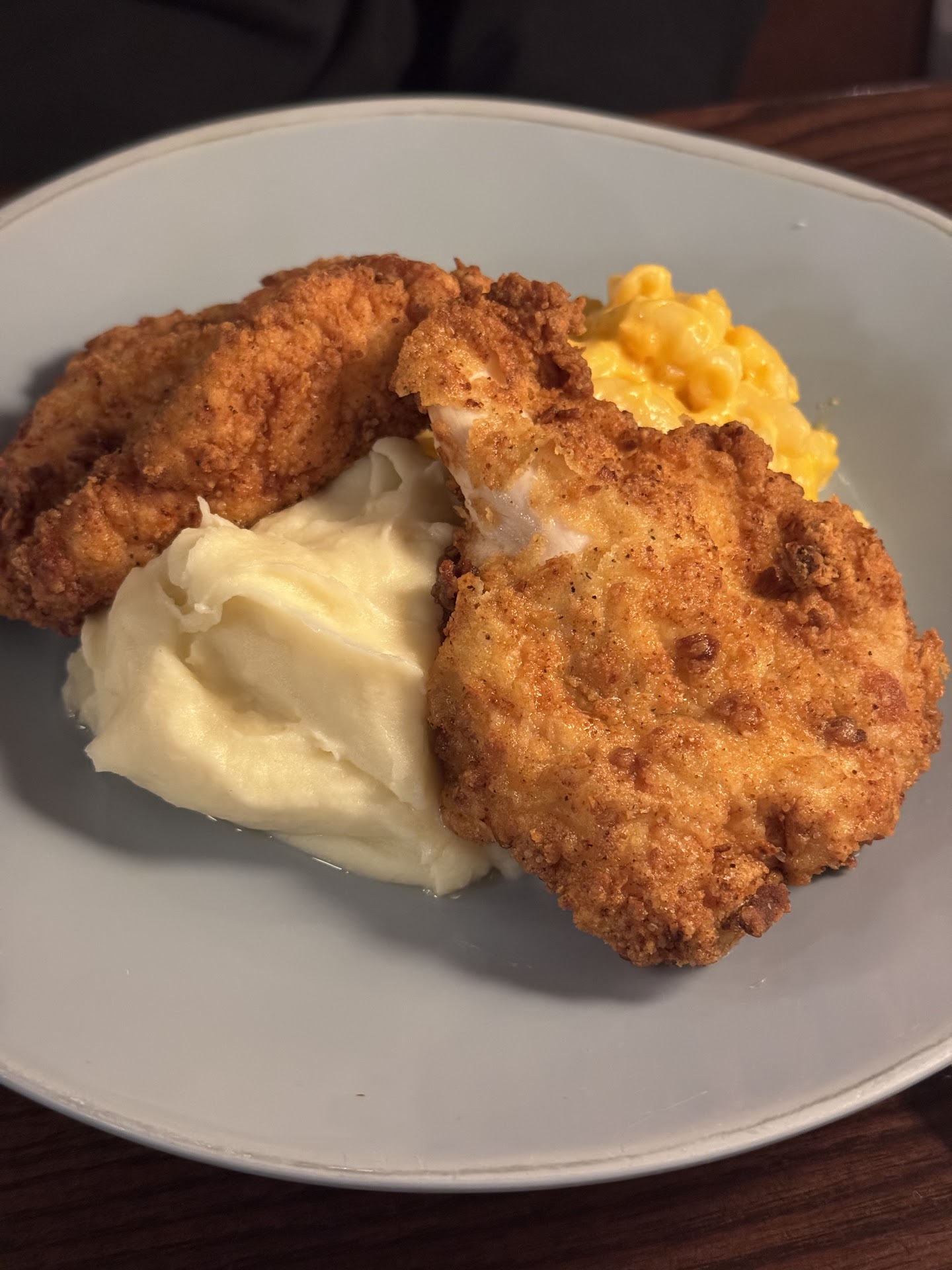 My bf got the fried chicken with mashed potatoes and mac & cheese. The chicken had a crunchy Southern-style crust. The mac and cheese was creamy and mellow, and the mashed potatoes were smooth and straightforward. Nothing fancy, just classic.